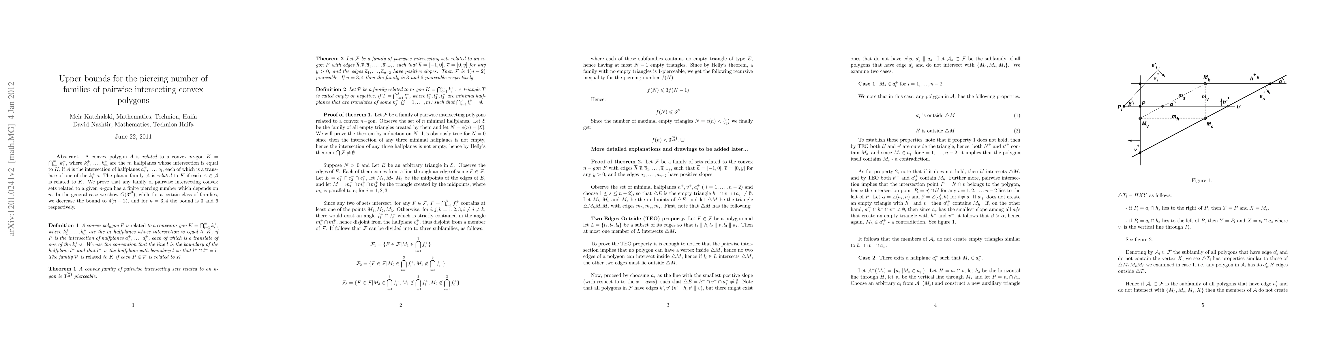 A convex polygon $A$ is related to a convex $m$-gon $K= \bigcap_{i=1}^m k_i^+$, where $k_1^+,..., k_m^+$ are the $m$ halfplanes whose intersection is equal to $K$, if $A$ is the intersection of halfplanes $a_1^+,...,a_l$, each of which is a translate of one of the $k_i^+$-s. The planar family ${\cal A}$ is related to $K$ if each $A \in {\cal A}$ is related to $K$. We prove that any family of pairwise intersecting convex sets related to a given $n$-gon has a finite piercing number which depends on $n$. In the general case we show $O(3^{n^3})$, while for a certain class of families, we decrease the bound to $4(n-2)$, and for $n=3,4$ the bound is 3 and 6 respectively.