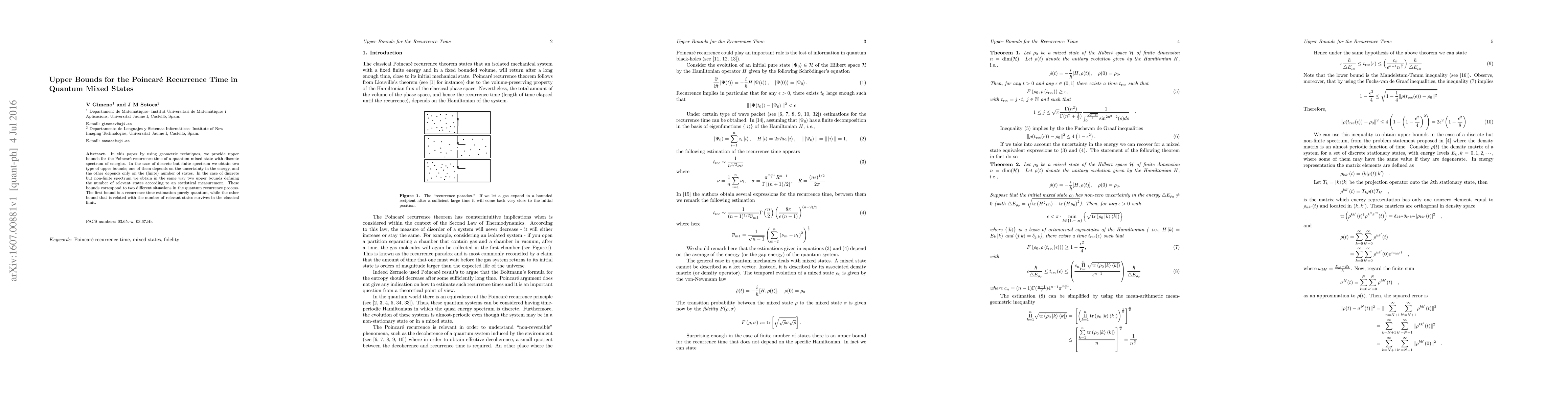 In this paper by using geometric techniques, we provide upper bounds for the Poincar\'e recurrence time of a quantum mixed state with discrete spectrum of energies. In the case of discrete but finite spectrum we obtain two type of upper bounds; one of them depends on the uncertainty in the energy, and the other depends only on the (finite) number of states. In the case of discrete but non-finite spectrum we obtain in the same way two upper bounds defining the number of relevant states according to an statistical measurement. These bounds correspond to two different situations in the quantum recurrence process. The first bound is a recurrence time estimation purely quantum, while the other bound that is related with the number of relevant states survives in the classical limit.