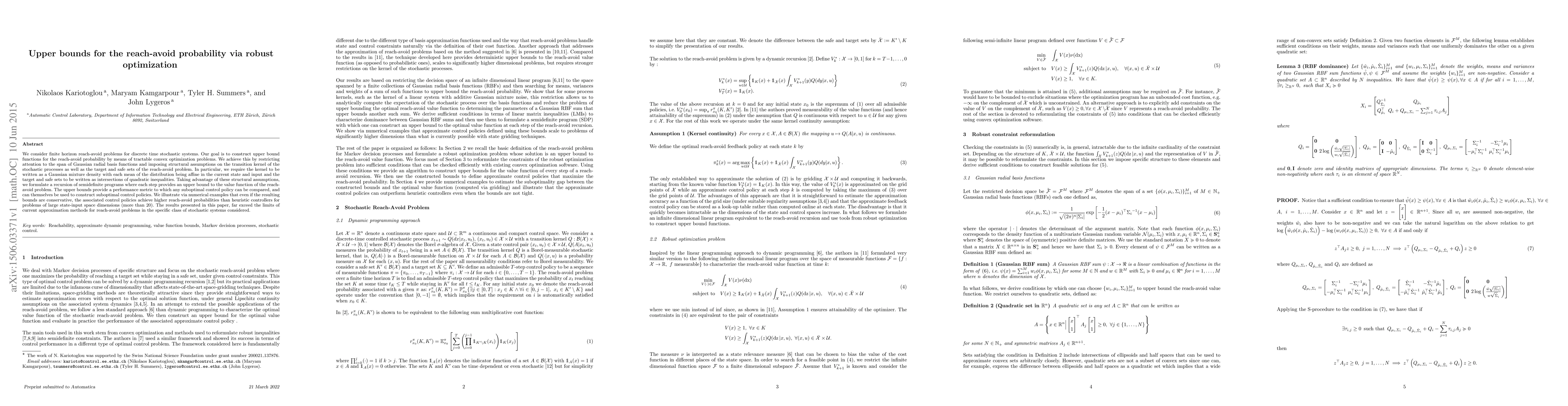 This paper develops upper bounds for reach-avoid probabilities in finite horizon stochastic systems using robust optimization and convex optimization. The authors achieve this through Gaussian radial basis functions and structural assumptions on the system's transition kernel and set definitions, leading to a recursion of semidefinite programs.