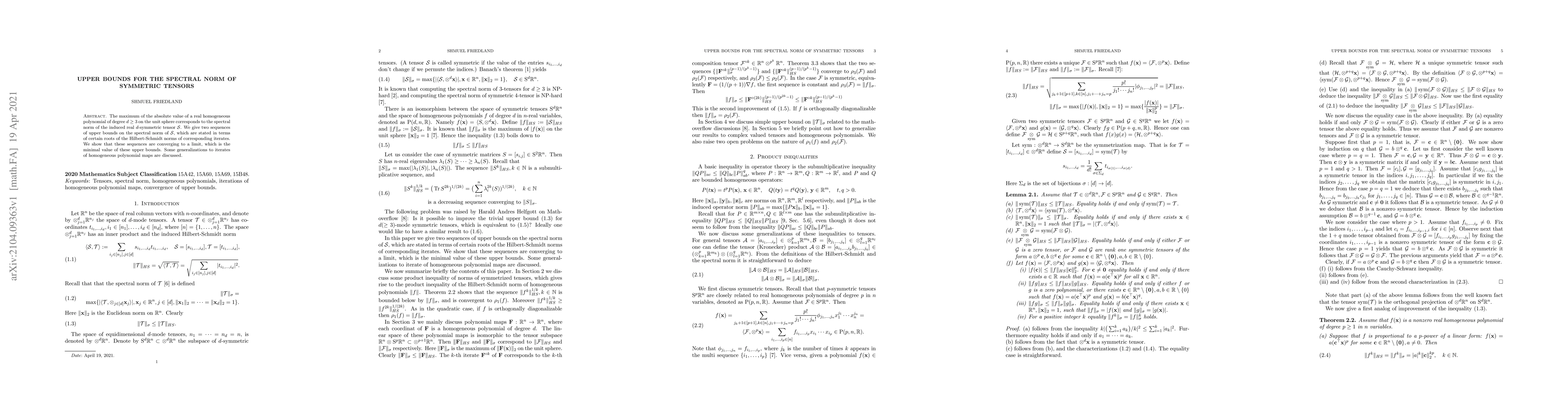 The paper presents two sequences of upper bounds for the spectral norm of $d$-symmetric tensors, converging to a minimal value, and discusses generalizations to iterates of homogeneous polynomial maps. These bounds relate to the maximum absolute value of real homogeneous polynomials on the unit sphere.