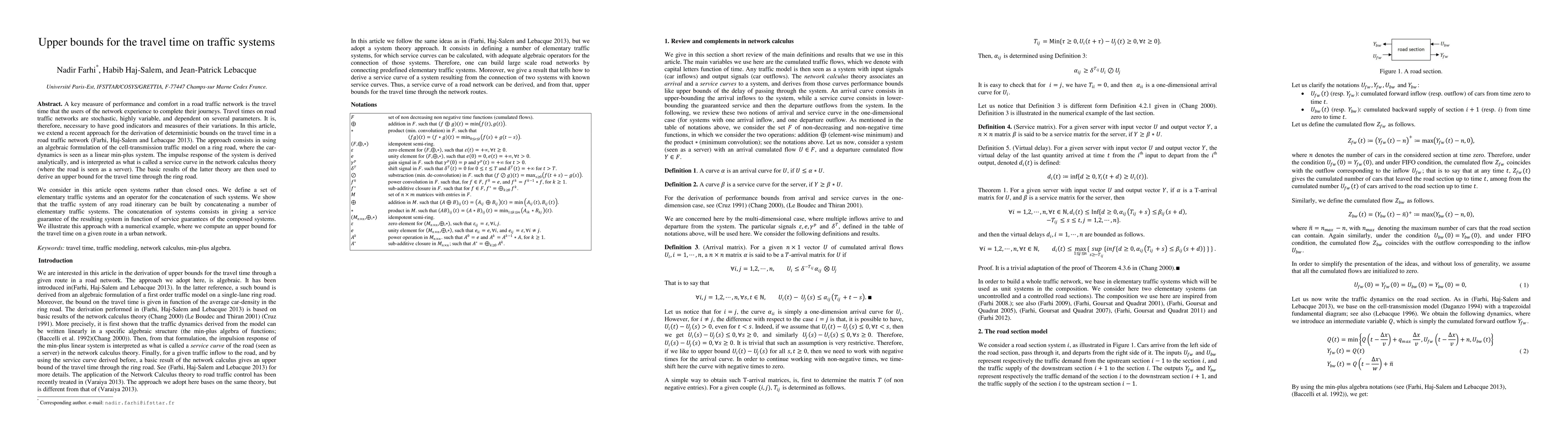 A key measure of performance and comfort in a road traffic network is the travel time that the users of the network experience to complete their journeys. Travel times on road traffic networks are stochastic, highly variable, and dependent on several parameters. It is, therefore, necessary to have good indicators and measures of their variations. In this article, we extend a recent approach for the derivation of deterministic bounds on the travel time in a road traffic network (Farhi, Haj-Salem and Lebacque 2013). The approach consists in using an algebraic formulation of the cell-transmission traffic model on a ring road, where the car-dynamics is seen as a linear min-plus system. The impulse response of the system is derived analytically, and is interpreted as what is called a service curve in the network calculus theory (where the road is seen as a server). The basic results of the latter theory are then used to derive an upper bound for the travel time through the ring road. We consider in this article open systems rather than closed ones. We define a set of elementary traffic systems and an operator for the concatenation of such systems. We show that the traffic system of any road itinerary can be built by concatenating a number of elementary traffic systems. The concatenation of systems consists in giving a service guarantee of the resulting system in function of service guarantees of the composed systems. We illustrate this approach with a numerical example, where we compute an upper bound for the travel time on a given route in a urban network.