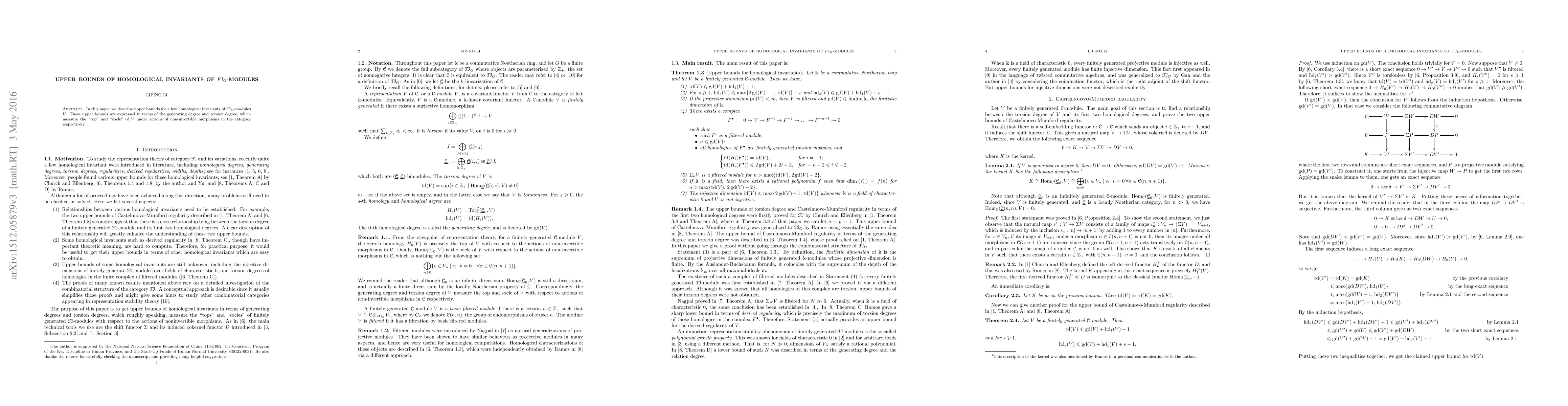 This paper employs a homological approach to derive upper bounds for certain homological invariants of $FI_G$-modules $V$, expressed in terms of the generating and torsion degrees that characterize the module's structure under non-invertible morphisms.