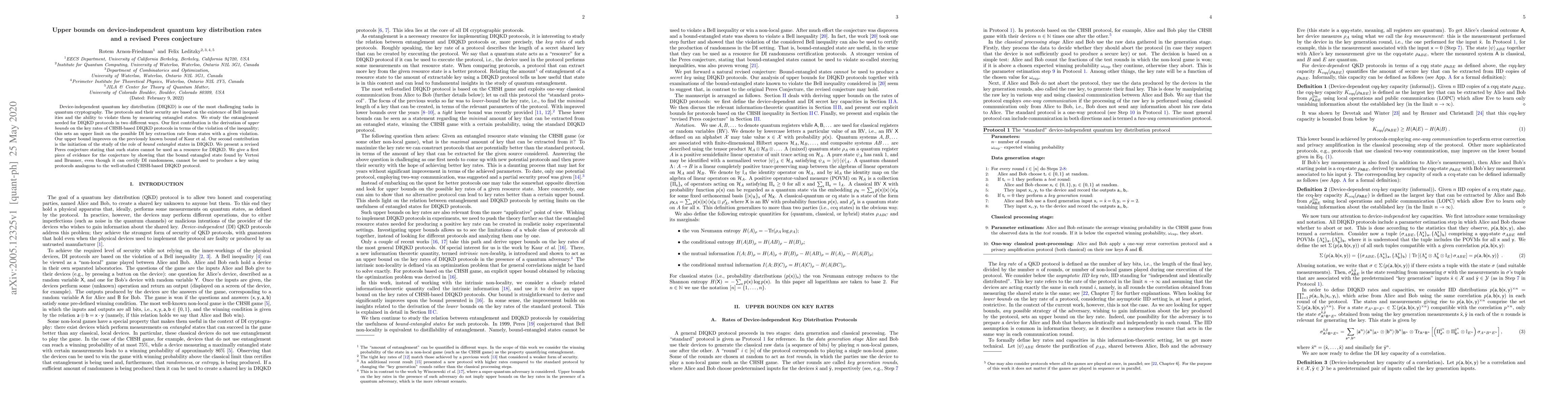 This paper establishes improved upper bounds on the key rates for CHSH-based device-independent quantum key distribution protocols, surpassing previous limits. It also initiates a study on the role of bound entangled states, proposing a revised Peres conjecture that such states cannot serve as a resource for DIQKD, supported by evidence against their use in key generation.