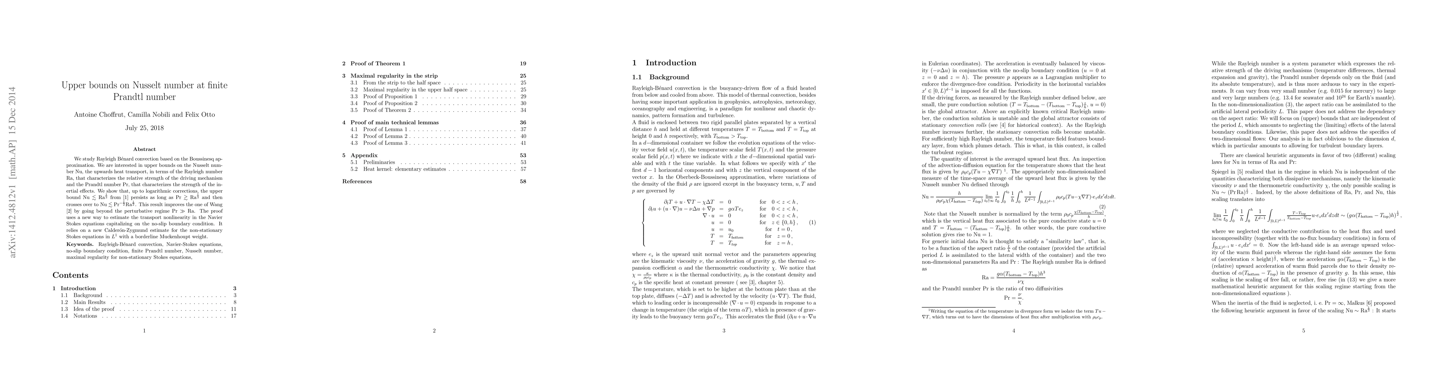 This research establishes upper bounds on heat transport (Nusselt number) in Rayleigh-Bénard convection, relating it to Rayleigh and Prandtl numbers. The study finds that for Pr ≥ Ra^(1/3), the upper bound is Nu ≲ Ra^(1/3), then transitions to Nu ≲ Pr^(-1/2) Ra^(1/2) for higher Prandtl numbers, improving on previous work by going beyond the perturbative regime. The proof uses a novel method to estimate transport nonlinearity in Navier-Stokes equations, based on a new Calderón-Zygmund estimate for non-stationary Stokes equations in L^1 with a borderline Muckenhoupt weight.