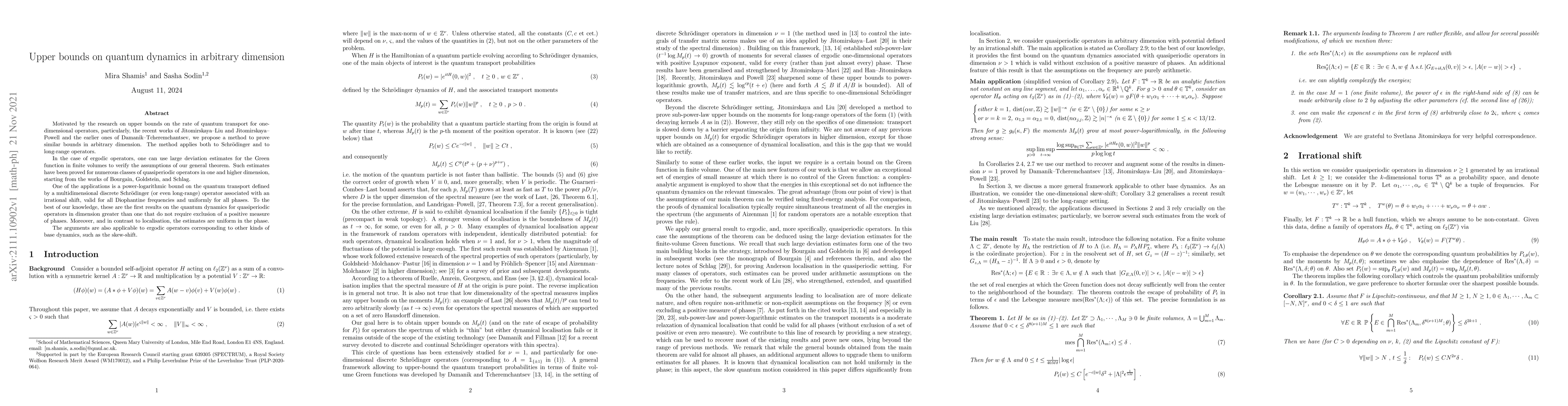 Motivated by the research on upper bounds on the rate of quantum transport for one-dimensional operators, particularly, the recent works of Jitomirskaya--Liu and Jitomirskaya--Powell and the earlier ones of Damanik--Tcheremchantsev, we propose a method to prove similar bounds in arbitrary dimension. The method applies both to Schroedinger and to long-range operators. In the case of ergodic operators, one can use large deviation estimates for the Green function in finite volumes to verify the assumptions of our general theorem. Such estimates have been proved for numerous classes of quasiperiodic operators in one and higher dimension, starting from the works of Bourgain, Goldstein, and Schlag. One of the applications is a power-logarithmic bound on the quantum transport defined by a multidimensional discrete Schr\"odinger (or even long-range) operator associated with an irrational shift, valid for all Diophantine frequencies and uniformly for all phases. To the best of our knowledge, these are the first results on the quantum dynamics for quasiperiodic operators in dimension greater than one that do not require exclusion of a positive measure of phases. Moreover, and in contrast to localisation, the estimates are uniform in the phase. The arguments are also applicable to ergodic operators corresponding to other kinds of base dynamics, such as the skew-shift.