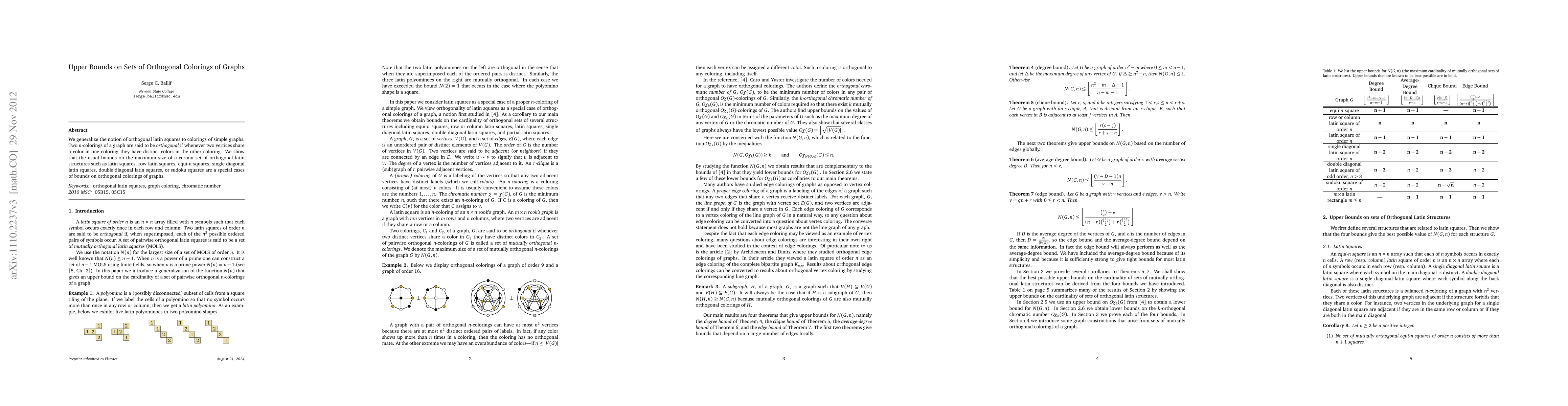 This paper generalizes orthogonal latin squares to orthogonal colorings of graphs, demonstrating that existing bounds on various orthogonal latin structures are special cases of bounds on these graph colorings. The study establishes upper limits for sets of orthogonal colorings in simple graphs.