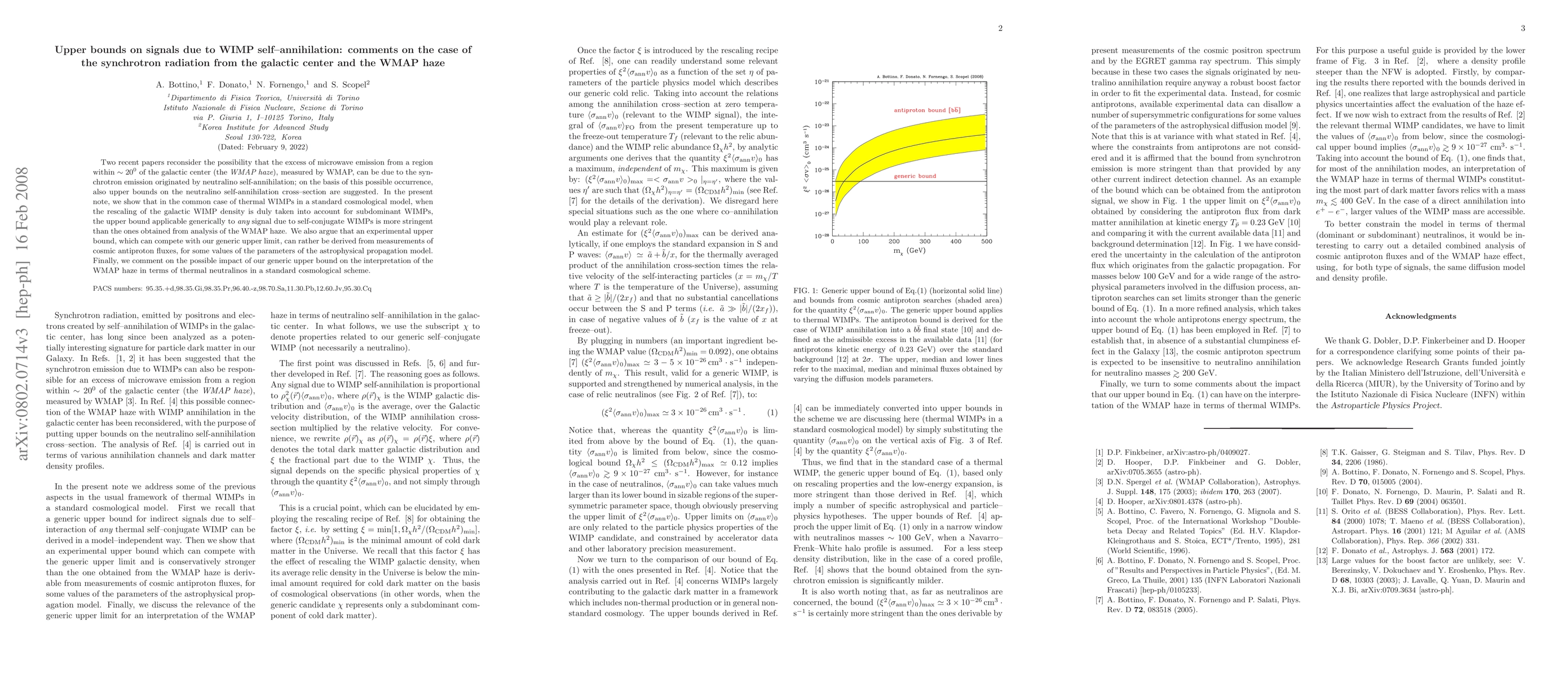 Two recent papers reconsider the possibility that the excess of microwave emission from a region within $\sim 20^0$ of the galactic center (the {\it WMAP haze}), measured by WMAP, can be due to the synchrotron emission originated by neutralino self-annihilation; on the basis of this possible occurrence, also upper bounds on the neutralino self-annihilation cross--section are suggested. In the present note, we show that in the common case of thermal WIMPs in a standard cosmological model, when the rescaling of the galactic WIMP density is duly taken into account for subdominant WIMPs, the upper bound applicable generically to {\it any} signal due to self-conjugate WIMPs is more stringent than the ones obtained from analysis of the WMAP haze. We also argue that an experimental upper bound, which can compete with our generic upper limit, can rather be derived from measurements of cosmic antiproton fluxes, for some values of the parameters of the astrophysical propagation model. Finally, we comment on the possible impact of our generic upper bound on the interpretation of the WMAP haze in terms of thermal neutralinos in a standard cosmological scheme.