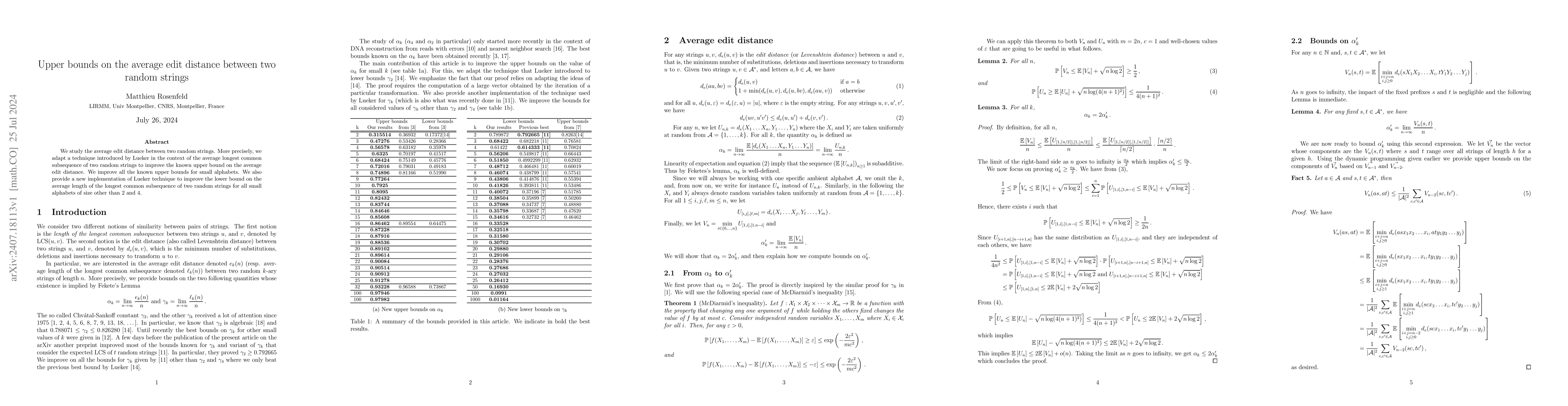 This paper improves the upper bound on the average edit distance between two random strings by adapting Lueker's technique, enhancing previous results for small alphabets. It also provides a new implementation of Lueker's method to improve the lower bound for the average length of the longest common subsequence for small alphabets, excluding sizes 2 and 4.