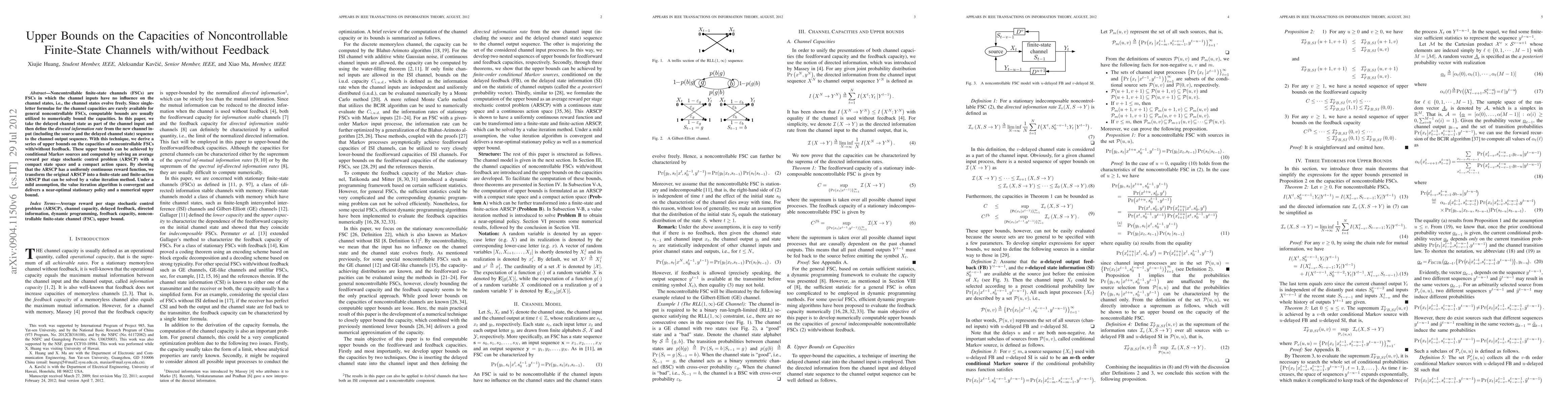 This paper develops upper bounds for the capacities of noncontrollable finite-state channels (FSCs) with/without feedback by introducing the directed information rate and solving an average reward per stage stochastic control problem (ARSCP). The bounds are achieved through conditional Markov sources and are computed using a value iteration method.