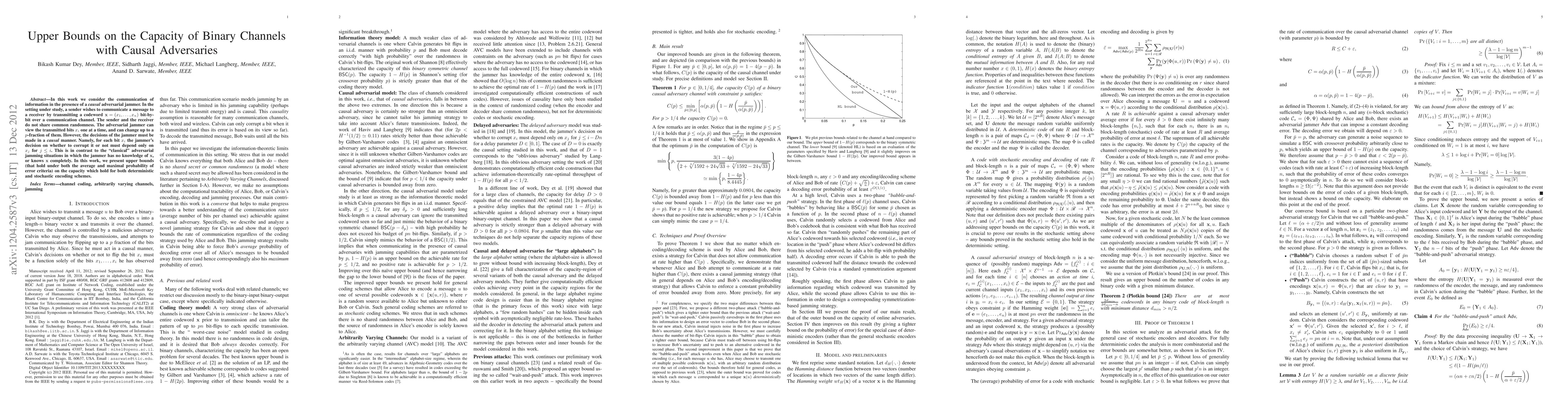 This paper sets upper bounds on the capacity of binary channels with causal adversarial jammers, considering both deterministic and stochastic encoding schemes under average and maximal probability of error criteria.