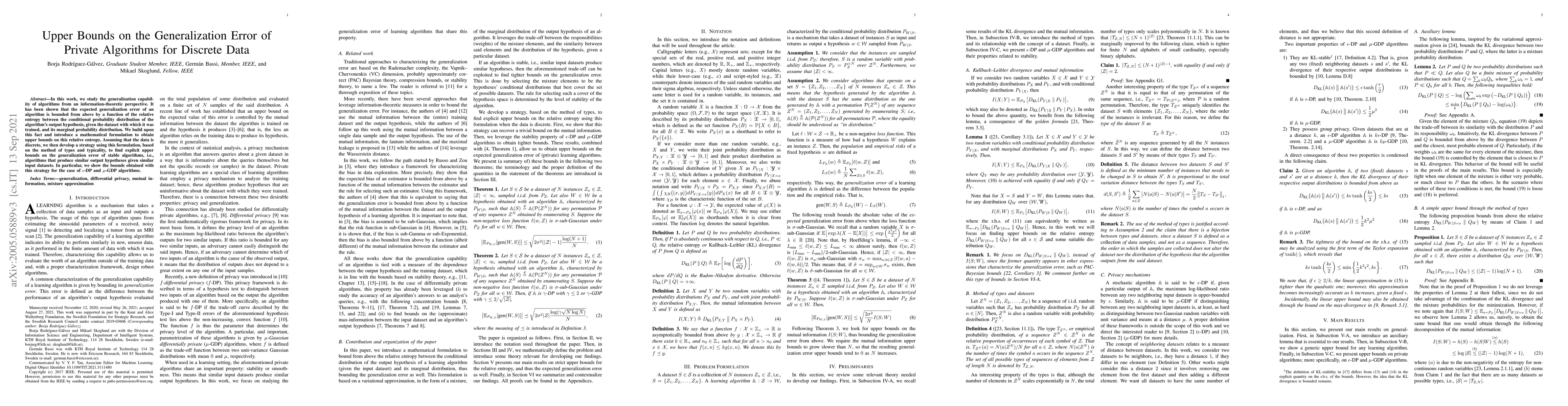 In this work, we study the generalization capability of algorithms from an information-theoretic perspective. It has been shown that the expected generalization error of an algorithm is bounded from above by a function of the relative entropy between the conditional probability distribution of the algorithm's output hypothesis, given the dataset with which it was trained, and its marginal probability distribution. We build upon this fact and introduce a mathematical formulation to obtain upper bounds on this relative entropy. Assuming that the data is discrete, we then develop a strategy using this formulation, based on the method of types and typicality, to find explicit upper bounds on the generalization error of stable algorithms, i.e., algorithms that produce similar output hypotheses given similar input datasets. In particular, we show the bounds obtained with this strategy for the case of $\epsilon$-DP and $\mu$-GDP algorithms.