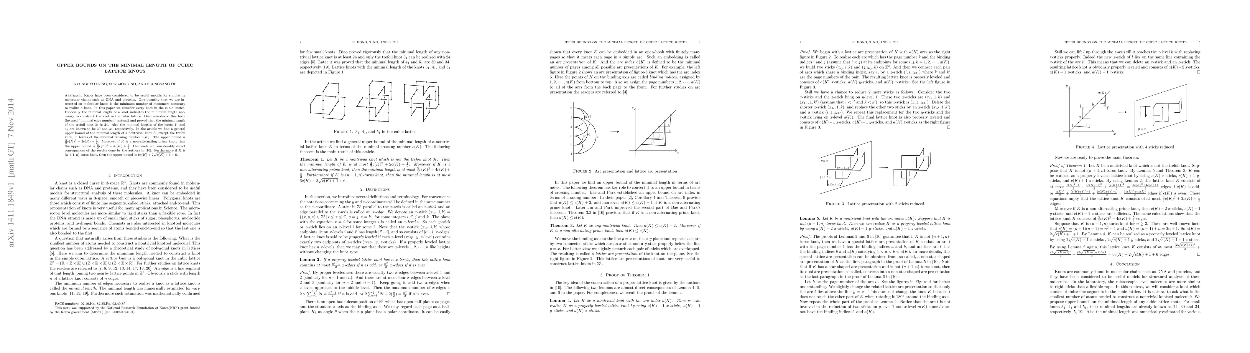 This paper establishes upper bounds for the minimal length of cubic lattice knots, which indicates the fewest monomers required to construct these knots. It provides a general upper bound for nontrivial knots, excluding the trefoil knot, in terms of their minimal crossing number.