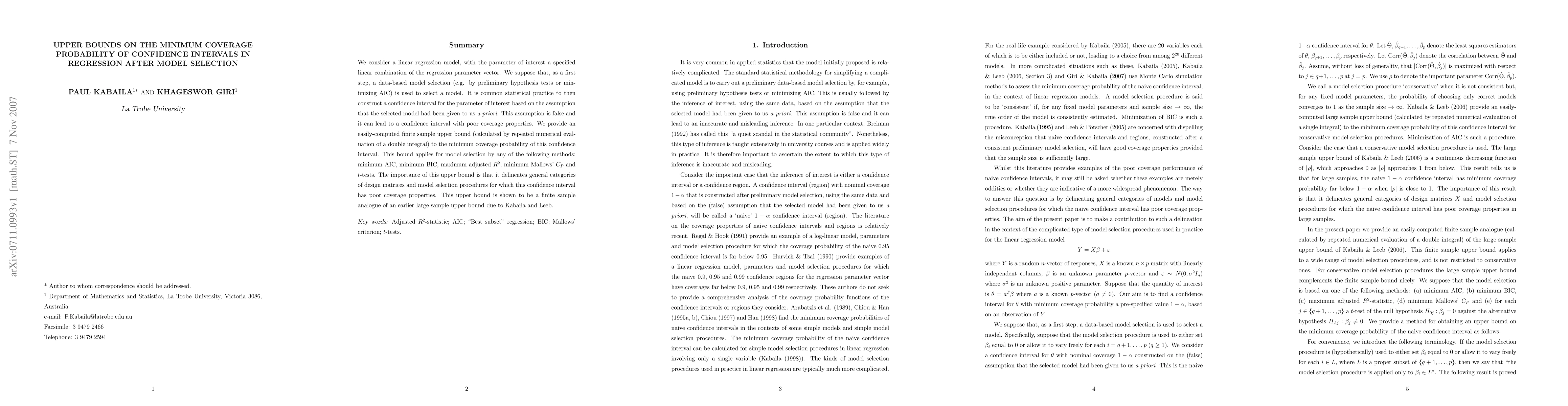 The paper presents a finite sample upper bound for the minimum coverage probability of confidence intervals in regression after variable selection, applicable to various model selection methods such as AIC, BIC, Mallows' Cp, and t-tests.