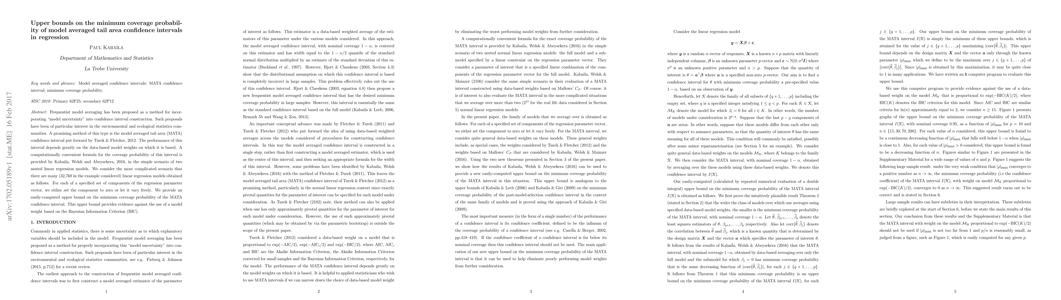 The paper derives an upper bound on the minimum coverage probability of the Model Averaged Tail Area (MATA) confidence interval in regression, considering many nested models obtained by varying components of the regression parameter vector.