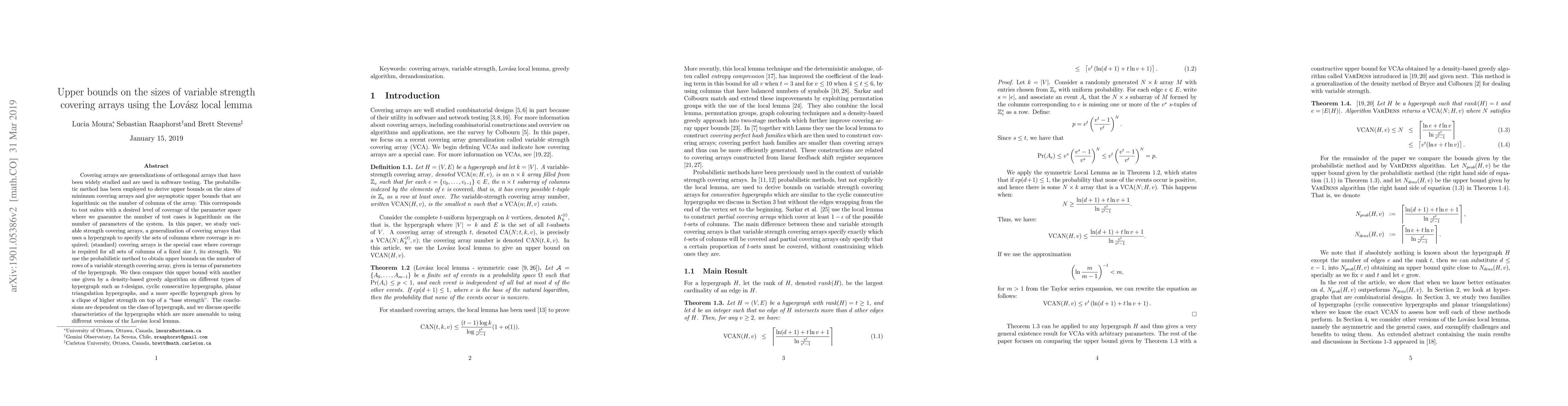 This paper uses the probabilistic method and the Lovász local lemma to derive upper bounds on the sizes of variable strength covering arrays, which generalize traditional covering arrays. The study compares these probabilistic bounds with those obtained from a density-based greedy algorithm across various hypergraph types, concluding that the effectiveness of different versions of the Lovász local lemma varies depending on the specific characteristics of the hypergraph.