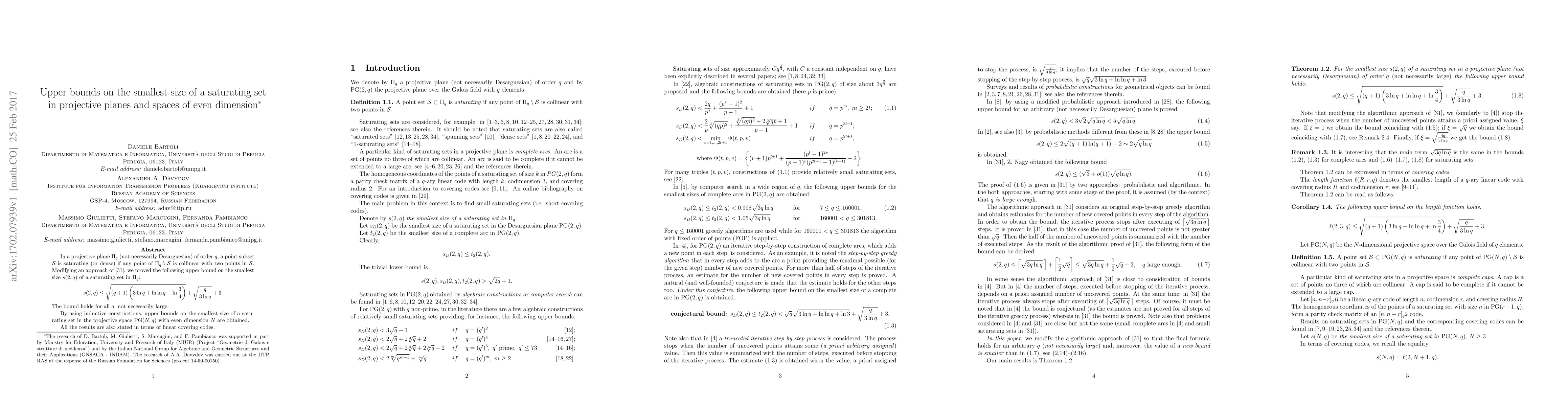 This paper establishes an upper bound for the smallest size of a saturating set in projective planes of order $q$, and extends this result to projective spaces of even dimension $N$. The derived bound is shown to hold for all $q$, not just large values.