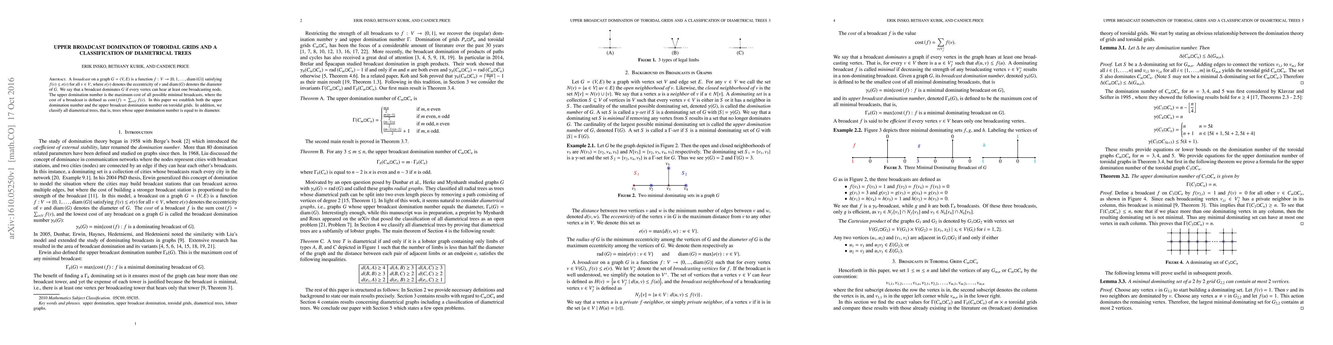 A broadcast on a graph $G=(V,E)$ is a function $f:V \rightarrow \{0,1, \ldots, \text{diam}(G)\}$ satisfying $f(v) \leq e(v)$ for all $v \in V$, where $e(v)$ denotes the eccentricity of $v$ and $\text{diam}(G)$ denotes the diameter of $G$. We say that a broadcast dominates $G$ if every vertex can hear at least one broadcasting node. The upper domination number is the maximum cost of all possible minimal broadcasts, where the cost of a broadcast is defined as $\text{cost} (f)= \sum_{v \in V}f(v)$. In this paper we establish both the upper domination number and the upper broadcast domination number on toroidal grids. In addition, we classify all diametrical trees, that is, trees whose upper domination number is equal to its diameter.