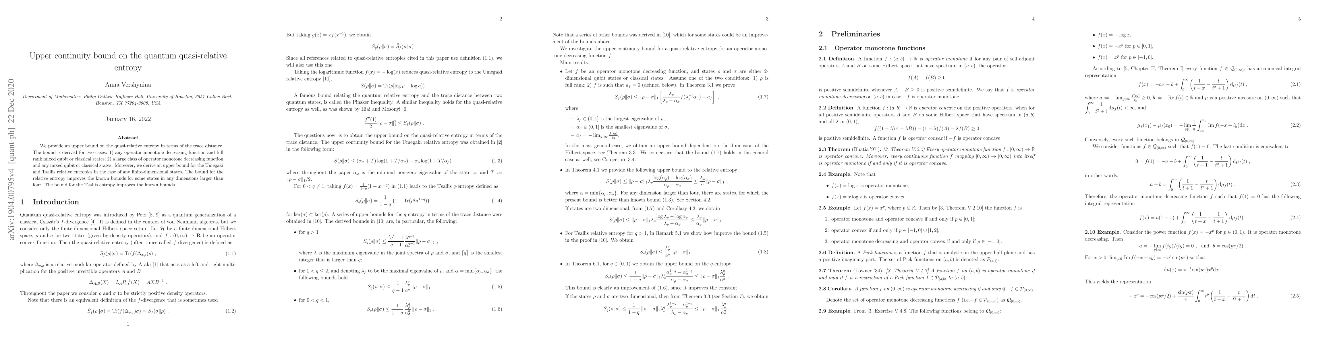 We provide an upper bound on the quasi-relative entropy in terms of the trace distance. The bound is derived for two cases: 1) any operator monotone decreasing function and full rank mixed qubit or classical states; 2) a large class of operator monotone decreasing function and any mixed qubit or classical states. Moreover, we derive an upper bound for the Umegaki and Tsallis relative entropies in the case of any finite-dimensional states. The bound for the relative entropy improves the known bounds for some states in any dimensions larger than four. The bound for the Tsallis entropy improves the known bounds.