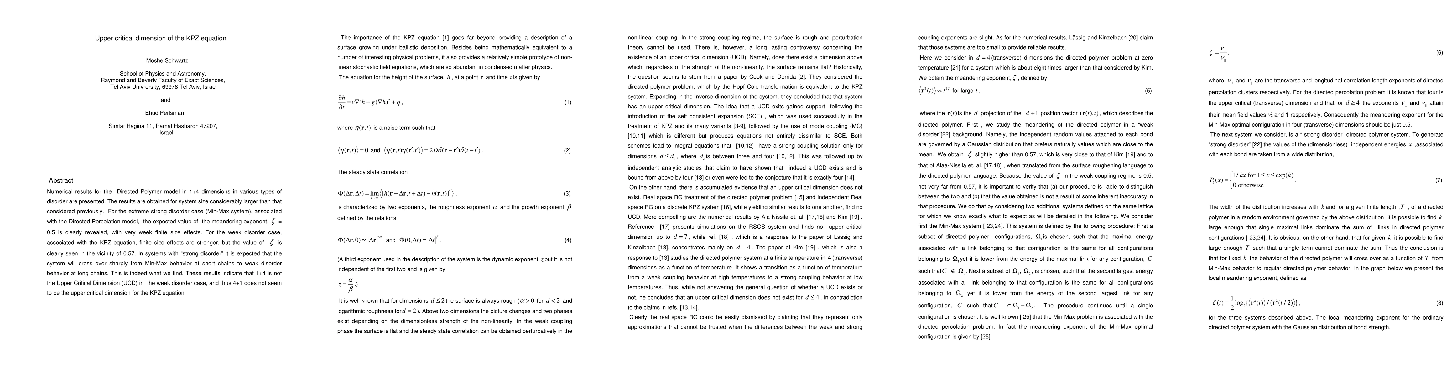 Numerical results for the Directed Polymer model in 1+4 dimensions in various types of disorder are presented. The results are obtained for system size considerably larger than that considered previously. For the extreme strong disorder case (Min-Max system), associated with the Directed Percolation model, the expected value of the meandering exponent, zeta = 0.5 is clearly revealed, with very week finite size effects. For the week disorder case, associated with the KPZ equation, finite size effects are stronger, but the value of seta is clearly seen in the vicinity of 0.57. In systems with "strong disorder" it is expected that the system will cross over sharply from Min-Max behavior at short chains to weak disorder behavior at long chains. This is indeed what we find. These results indicate that 1+4 is not the Upper Critical Dimension (UCD) in the week disorder case, and thus 4+1 does not seem to be the upper critical dimension for the KPZ equation.