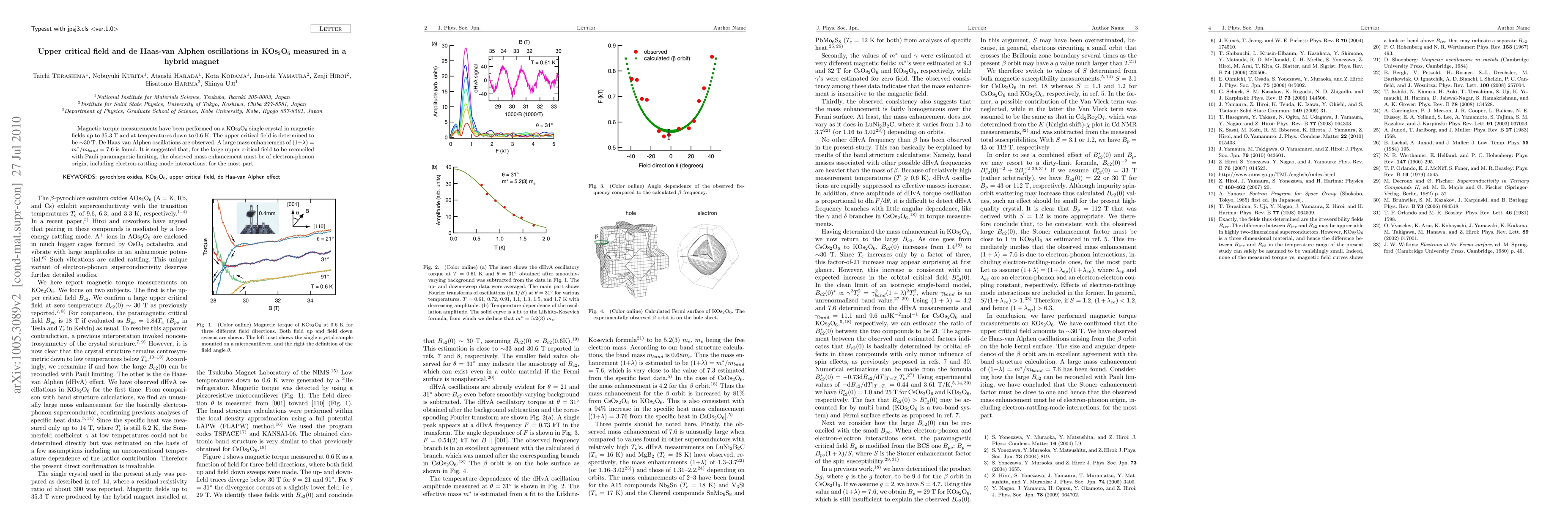 Researchers measured magnetic torque in KOs$_2$O$_6$ up to 35.3 T and found a large mass enhancement of 7.6, suggesting electron-phonon origin for the upper critical field's reconcilability with Pauli paramagnetic limiting.