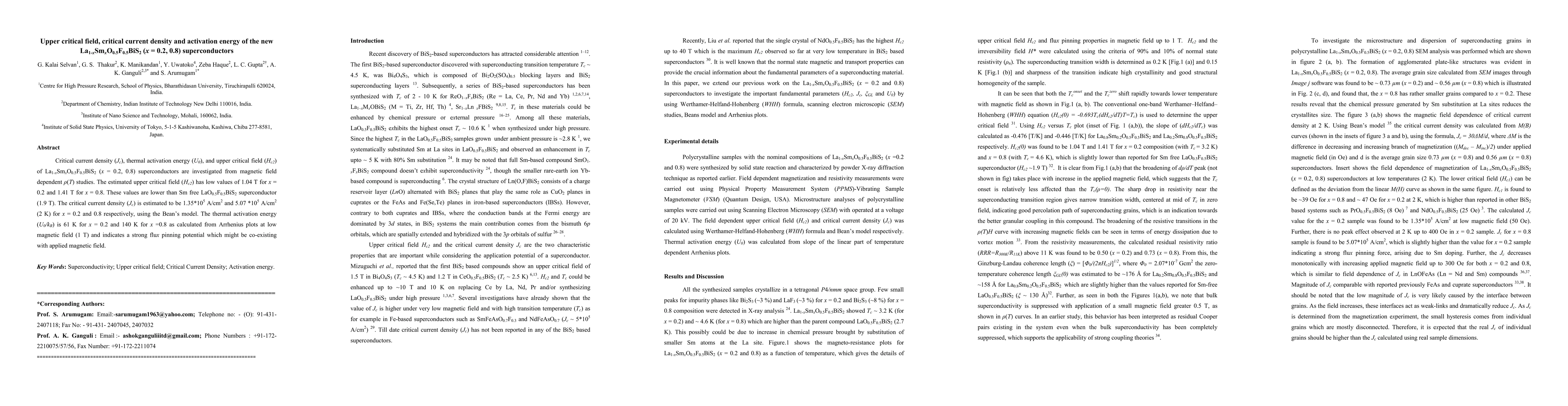 Researchers investigated La1-xSmxOF0.5BiS2 superconductors, finding lower upper critical fields (1.04-1.41 T) than a similar compound, with estimated critical current densities of 1.35*10^5 A/cm^2 and thermal activation energies of 61-140 K.
