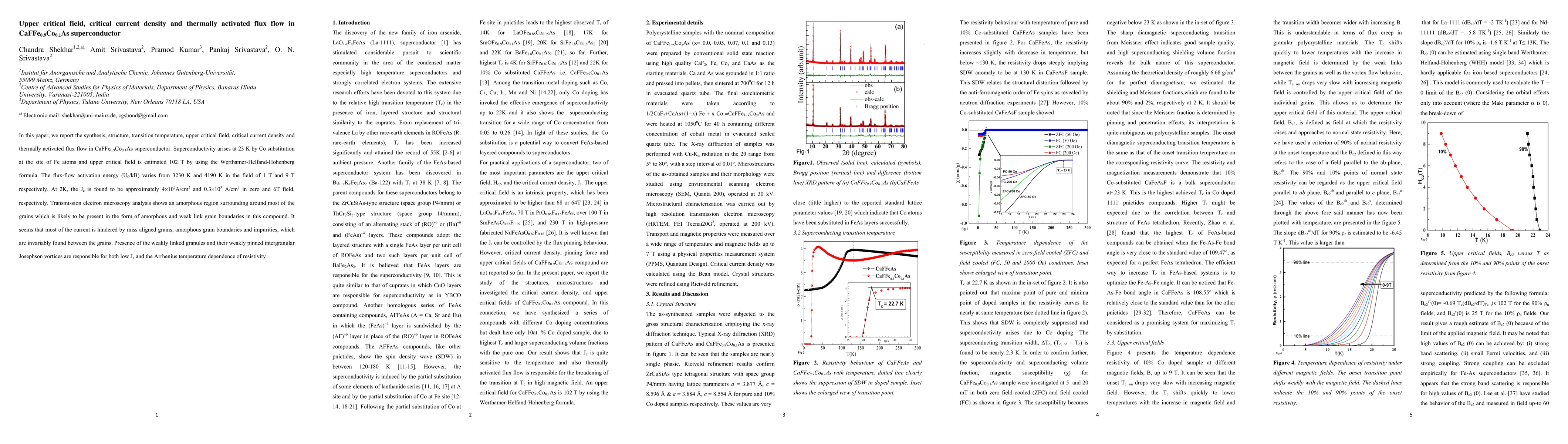 This paper investigates CaFe0.9Co0.1As, a superconductor exhibiting superconductivity at 23 K. The upper critical field is estimated at 102 T, and the critical current density (Jc) varies significantly with magnetic field, showing Jc ≈ 4x10^3 A/cm^2 at 2 K in zero field and 0.3x10^3 A/cm^2 at 6 T. The low Jc is attributed to misaligned grains, amorphous grain boundaries, and impurities, which hinder current flow.