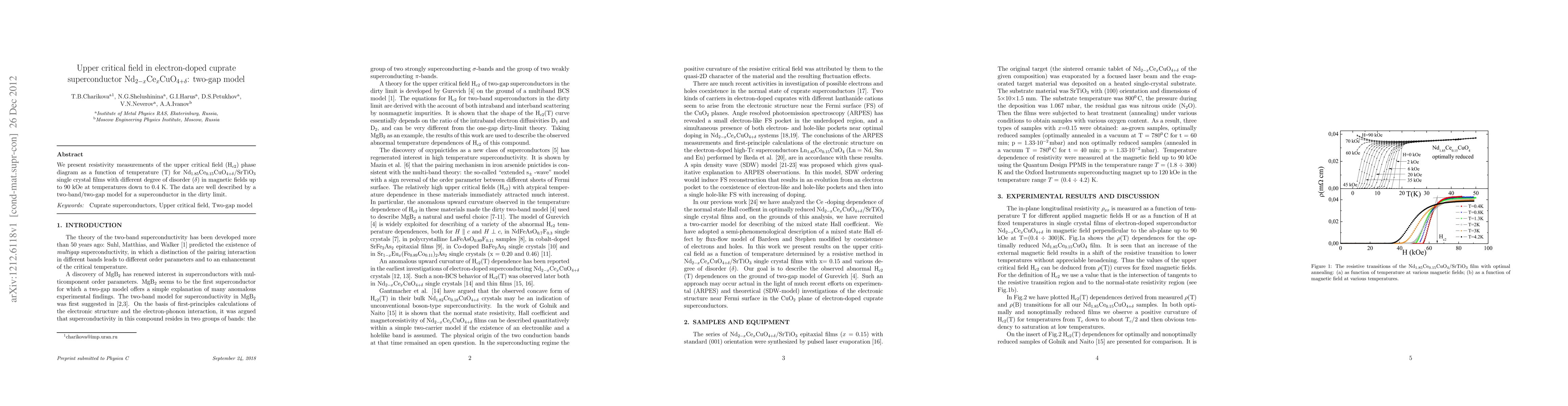 We present resistivity measurements of the upper critical field (H$_{c2}$) phase diagram as a function of temperature (T) for Nd$_{1.85}$Ce$_{0.15}$CuO$_{4+\delta}$/SrTiO$_3$ single crystal films with different degree of disorder ($\delta$) in magnetic fields up to 90 kOe at temperatures down to 0.4 K. The data are well described by a two-band/two-gap model for a superconductor in the dirty limit.