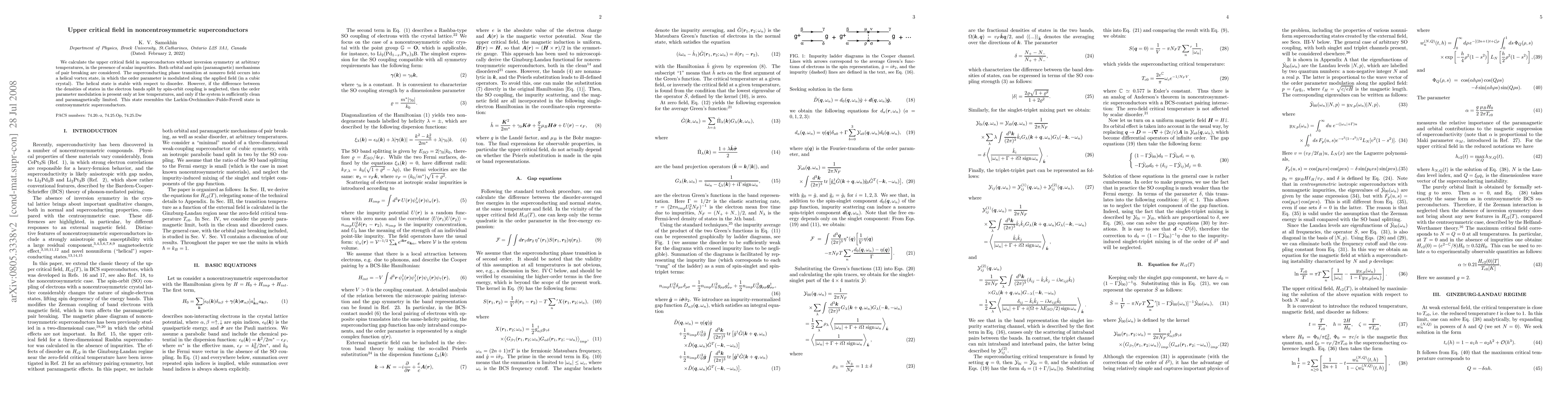 This paper calculates the upper critical field in noncentrosymmetric superconductors at various temperatures, considering both orbital and spin pair breaking mechanisms. It reveals that the superconducting phase transition leads to a helical vortex state stable against disorder, resembling the Larkin-Ovchinnikov-Fulde-Ferrell state under certain conditions.