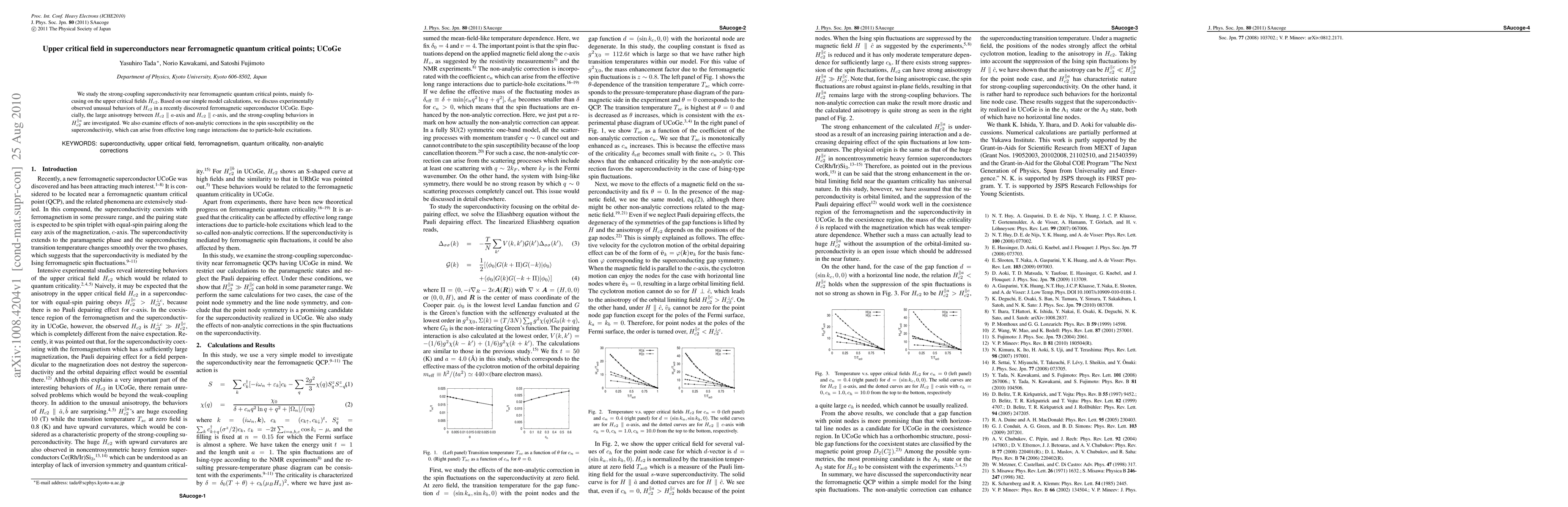 This paper investigates the upper critical field $H_{c2}$ in the ferromagnetic superconductor UCoGe near quantum critical points, highlighting unusual anisotropy and strong-coupling behaviors. The study also explores non-analytic corrections in spin susceptibility due to long-range interactions affecting superconductivity.