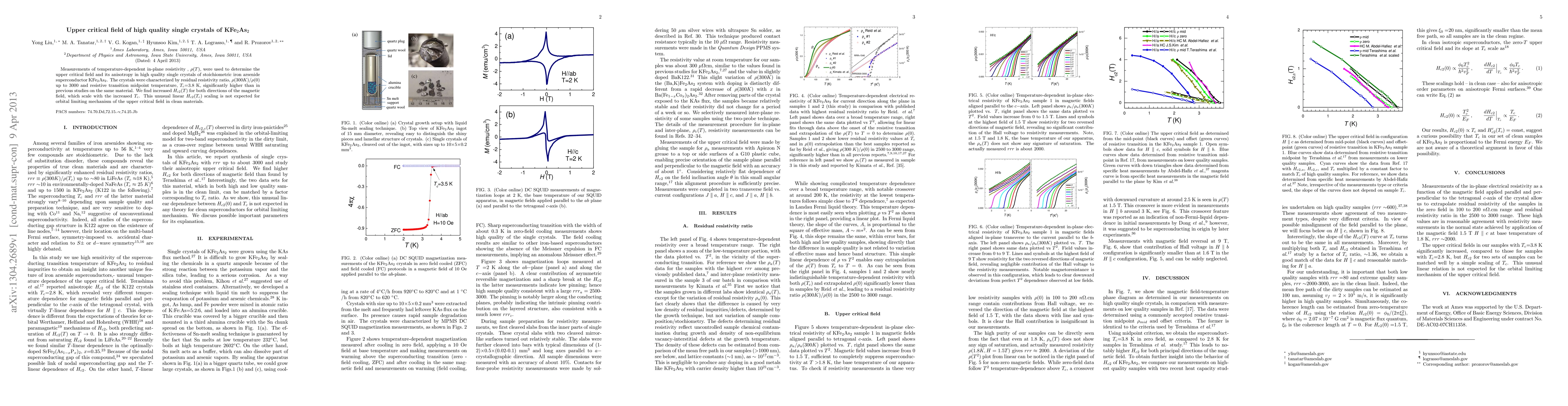 Measurements of temperature-dependent in-plane resistivity, $\rho(T)$, were used to determine the upper critical field and its anisotropy in high quality single crystals of stoichiometric iron arsenide superconductor KFe$_2$As$_2$. The crystals were characterized by residual resistivity ratio, $\rho(300K)/\rho(0)$ up to 3000 and resistive transition midpoint temperature, $T_c$=3.8 K, significantly higher than in previous studies on the same material. We find increased $H_{c2}(T)$ for both directions of the magnetic field, which scale with the increased $T_c$. This unusual linear $H_{c2}(T_c)$ scaling is not expected for orbital limiting mechanism of the upper critical field in clean materials.
