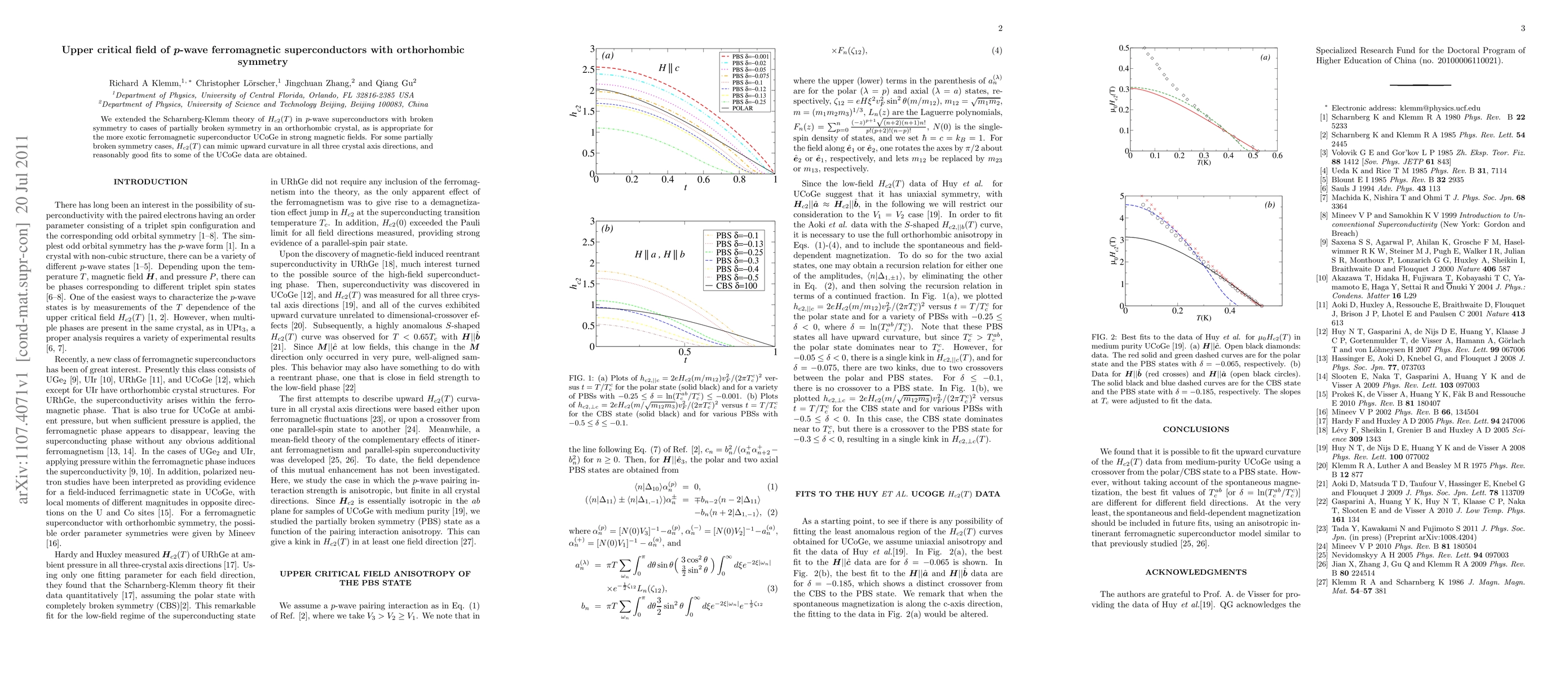 We extended the Scharnberg-Klemm theory of $H_{c2}(T)$ in p-wave superconductors with broken symmetry to cases of partially broken symmetry in an orthorhombic crystal, as is appropriate for the more exotic ferromagnetic superconductor UCoGe in strong magnetic fields. For some partially broken symmetry cases, $H_{c2}(T)$ can mimic upward curvature in all three crystal axis directions, and reasonably good fits to some of the UCoGe data are obtained.
