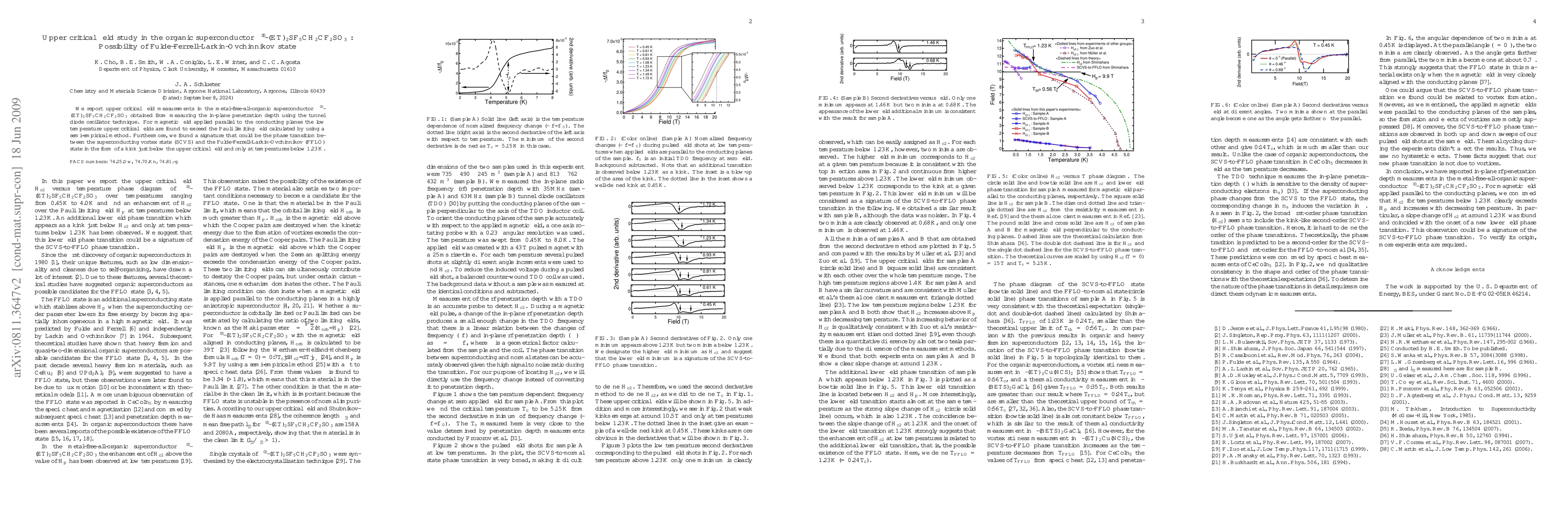 We report upper critical field measurements in the metal-free-all-organic superconductor $\beta''$-(ET)$_{2}$SF$_{5}$CH$_{2}$CF$_{2}$SO$_{3}$ obtained from measuring the in-plane penetration depth using the tunnel diode oscillator technique. For magnetic field applied parallel to the conducting planes the low temperature upper critical fields are found to exceed the Pauli limiting field calculated by using a semi-empirical method. Furthermore, we found a signature that could be the phase transition between the superconducting vortex state and the Fulde-Ferrell-Larkin-Ovchinnikov state in the form of a kink just below the upper critical field and only at temperatures below 1.23 K.