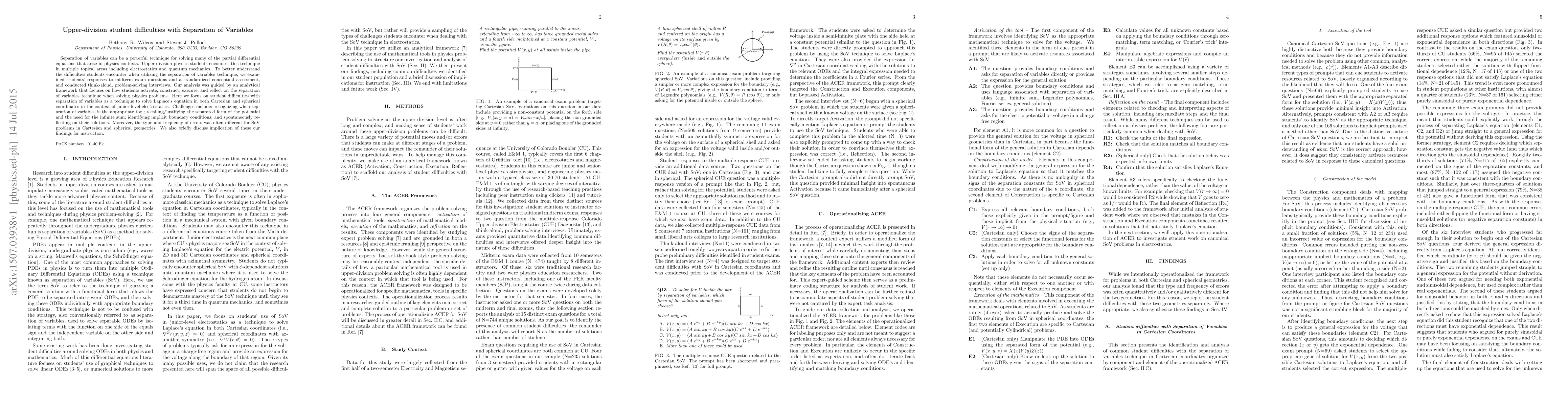 This study explores upper-division students' challenges with the separation of variables technique when solving Laplace's equation in electrostatics, identifying difficulties in recognizing its appropriateness, recalling the separated form, and reflecting on solutions. The study also highlights different error types in Cartesian versus spherical coordinate problems.