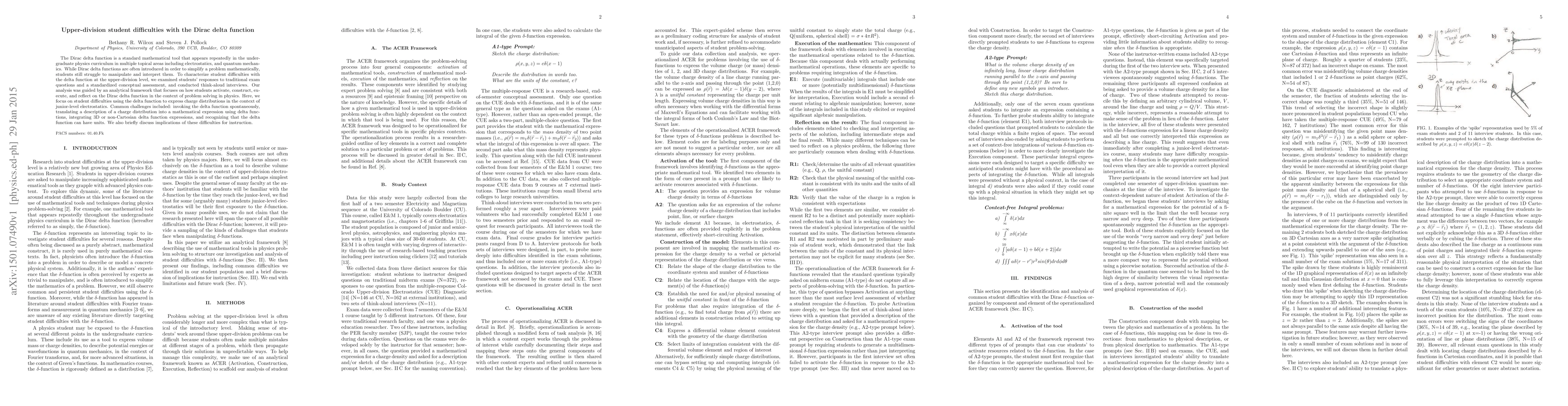 This study investigates the challenges upper-division students face in using the Dirac delta function in physics, particularly in electrostatics. Common difficulties include spontaneous invocation, translating physical descriptions into mathematical expressions, integrating complex delta function expressions, and understanding the delta function's units. These insights inform potential instructional improvements.
