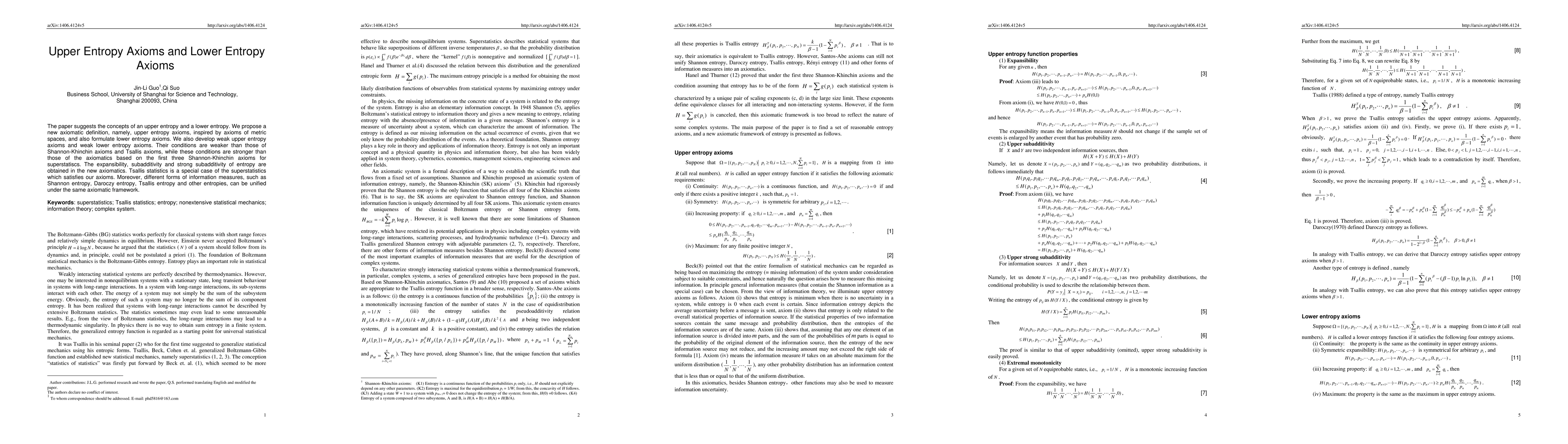The paper introduces the concepts of upper and lower entropy axioms, proposing a new axiomatic framework that unifies various information measures, including Shannon and Tsallis entropies, while being more general than existing axiomatics for superstatistics. The new axioms ensure properties like expansibility and subadditivity of entropy.