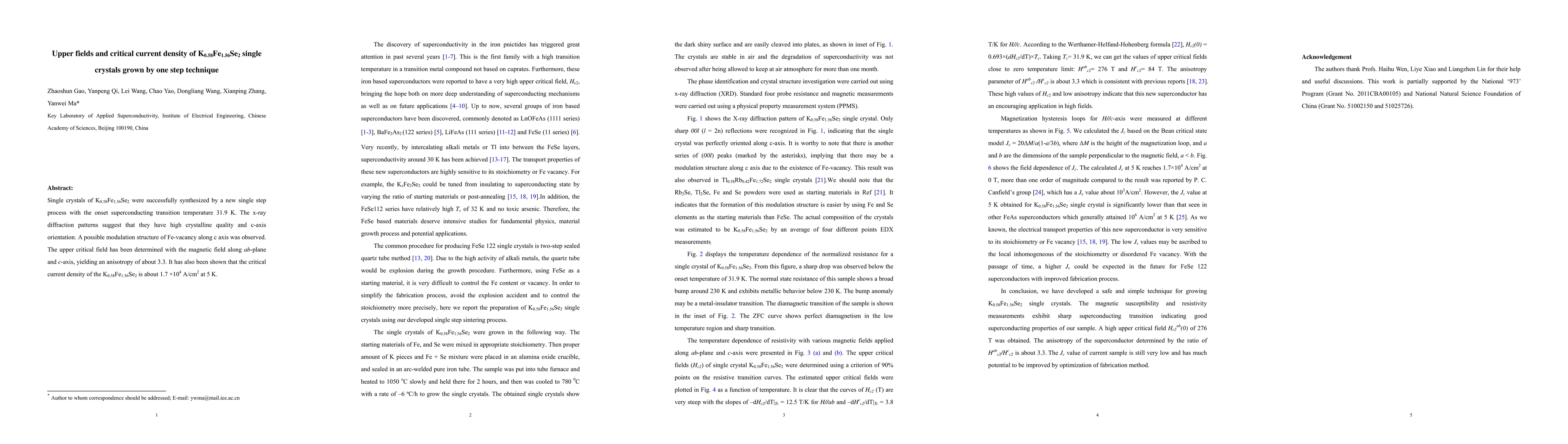 The research successfully grew K0.58Fe1.56Se2 single crystals via a novel one-step method, achieving a superconducting transition temperature of 31.9K. The crystals showed high quality, c-axis orientation, and an upper critical field anisotropy of 3.3, with a critical current density of approximately 1.7x10^4 A/cm^2 at 5K.