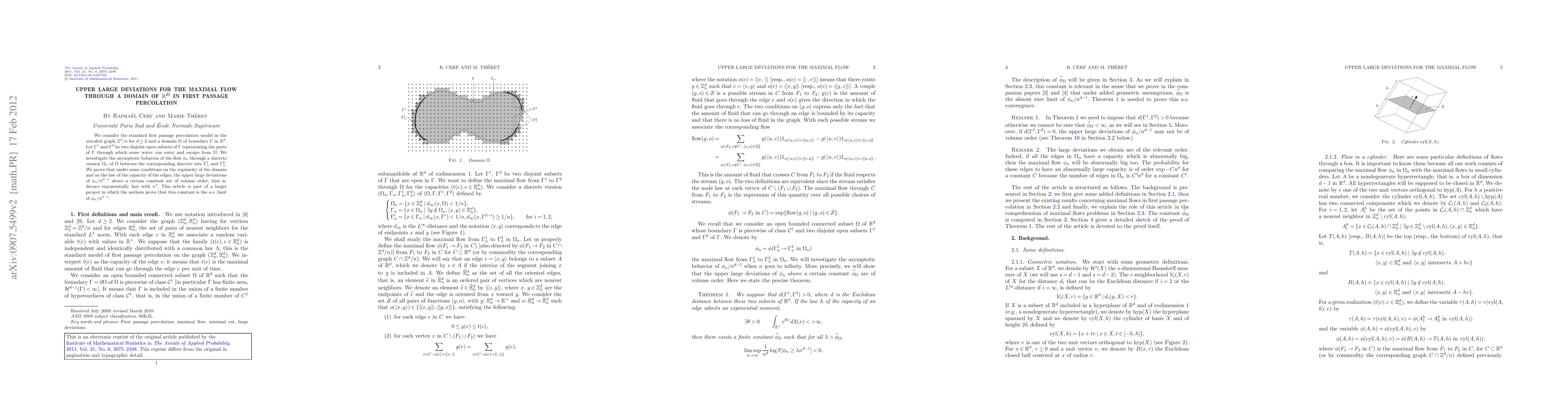 This paper investigates the asymptotic behavior of maximal flow through a domain in first passage percolation, showing that upper large deviations decay exponentially fast with n^d under certain conditions.