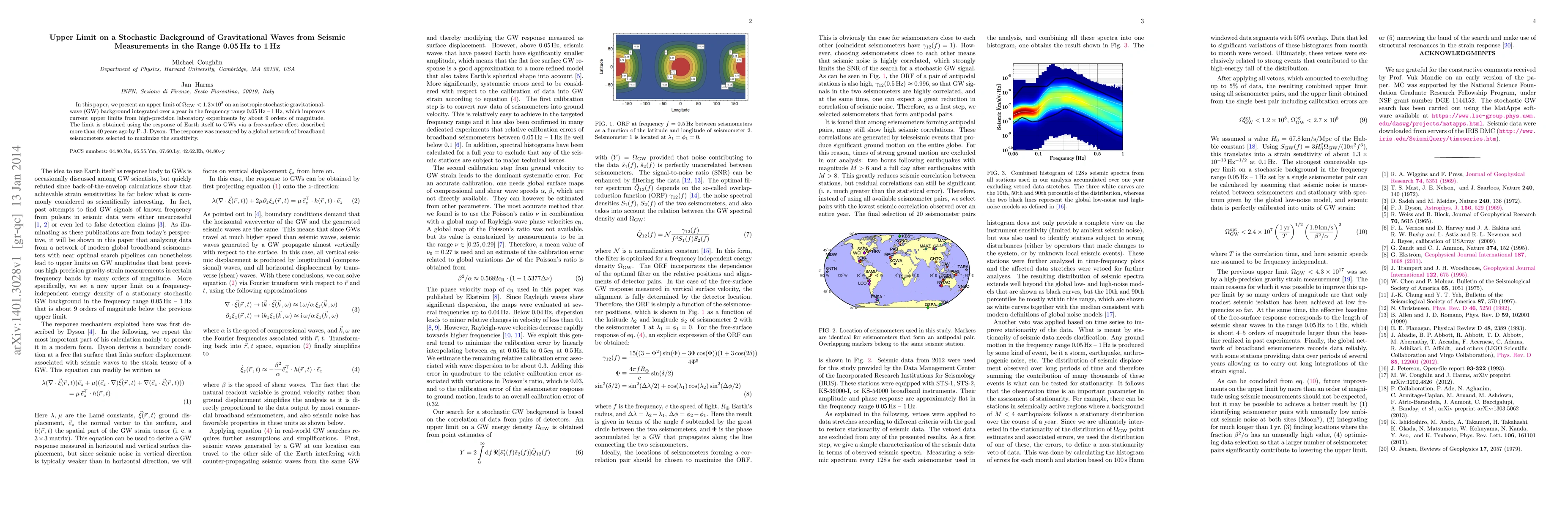In this paper, we present an upper limit of $\Omega_{\rm GW}<1.2\times 10^{8}$ on an isotropic stochastic gravitational-wave (GW) background integrated over a year in the frequency range 0.05 Hz - 1 Hz, which improves current upper limits from high-precision laboratory experiments by about 9 orders of magnitude. The limit is obtained using the response of Earth itself to GWs via a free-surface effect described more than 40 years ago by F.J. Dyson. The response was measured by a global network of broadband seismometers selected to maximize the sensitivity.
