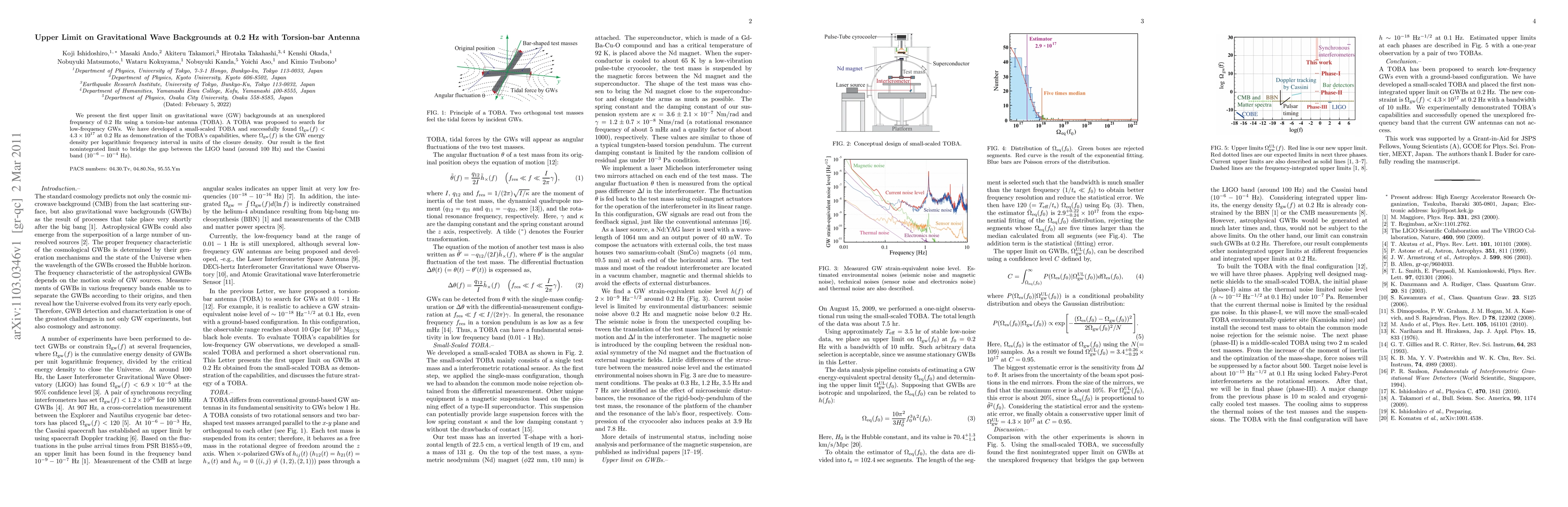 This paper reports the first upper limit on gravitational wave backgrounds at 0.2 Hz using a torsion-bar antenna, demonstrating the TOBA's capability to detect low-frequency GWs. The study found an upper limit of {\Omega}gw(f) < 4.3 × 10^17 at 0.2 Hz, bridging the frequency gap between LIGO and Cassini bands.