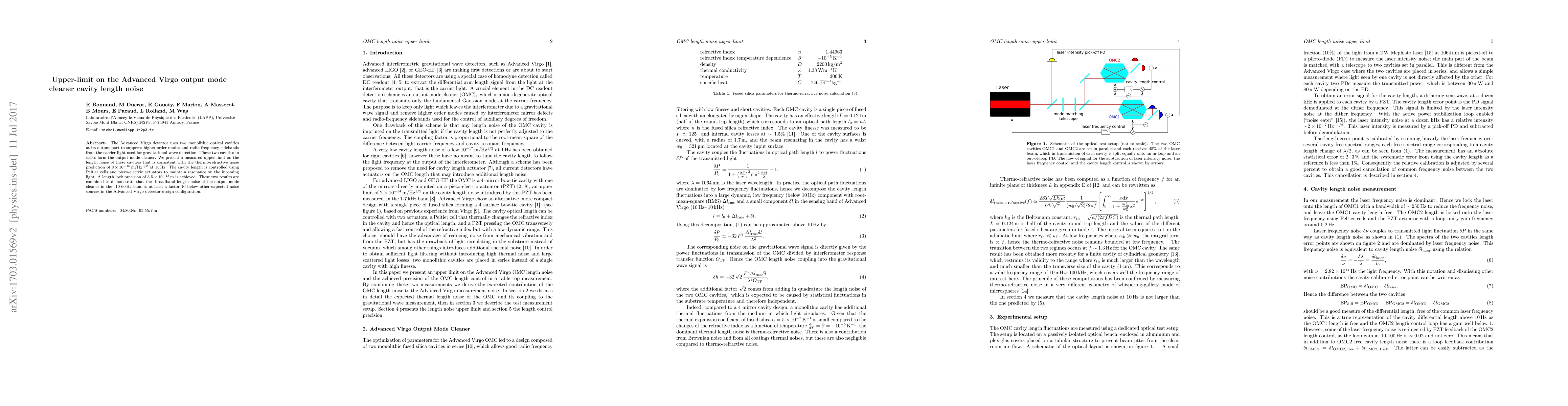 The Advanced Virgo detector uses two monolithic optical cavities at its output port to suppress higher order modes and radio frequency sidebands from the carrier light used for gravitational wave detection. These two cavities in series form the output mode cleaner. We present a measured upper limit on the length noise of these cavities that is consistent with the thermo-refractive noise prediction of $8 \times 10^{-16}\,\textrm{m/Hz}^{1/2}$ at 15 Hz. The cavity length is controlled using Peltier cells and piezo-electric actuators to maintain resonance on the incoming light. A length lock precision of $3.5 \times 10^{-13}\,\textrm{m}$ is achieved. These two results are combined to demonstrate that the broadband length noise of the output mode cleaner in the 10-60 Hz band is at least a factor 10 below other expected noise sources in the Advanced Virgo detector design configuration.