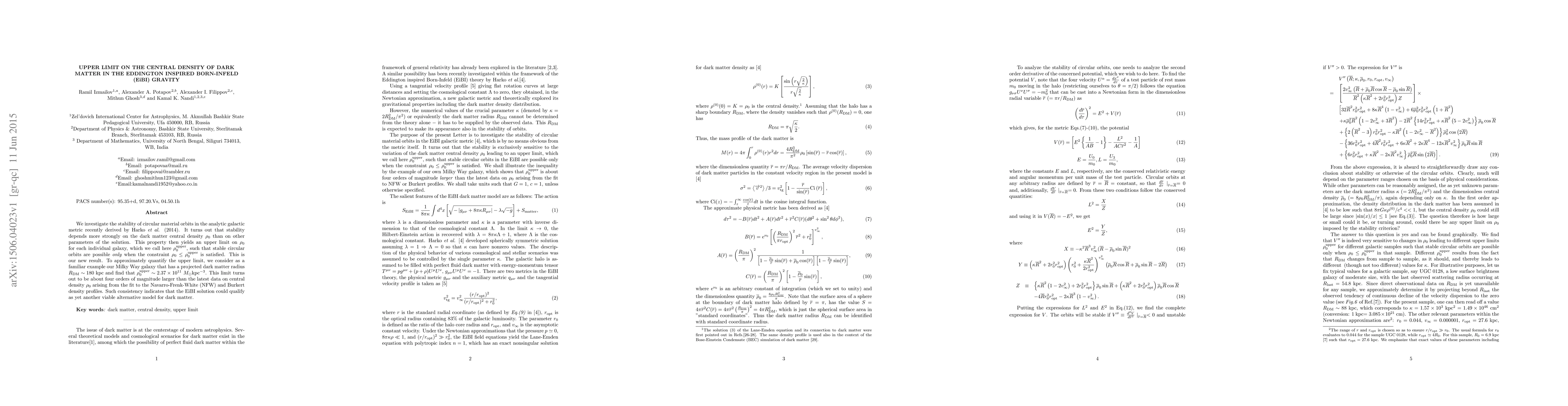 We investigate the stability of circular material orbits in the analytic galactic metric recently derived by Harko \textit{et al.} (2014). It turnsout that stability depends more strongly on the dark matter central density $%\rho_{0}$ than on other parameters of the solution. This property then yields an upper limit on $\rho _{0}$ for each individual galaxy, which we call here $\rho _{0}^{\text{upper}}$, such that stable circular orbits are possible \textit{only} when the constraint $\rho _{0}\leq \rho _{0}^{\text{upper}}$ is satisfied. This is our new result. To approximately quantify the upper limit, we consider as a familiar example our Milky Way galaxy that has a projected dark matter radius $R_{\text{DM}}\sim 180$ kpc and find that $\rho _{0}^{\text{upper}}\sim 2.37\times 10^{11}$ $M_{\odot }$kpc$^{-3}$. This limit turns out to be about four orders of magnitude larger than the latest data on central density $\rho _{0}$ arising from the fit to the Navarro-Frenk-White (NFW) and Burkert density profiles. Such consistency indicates that the EiBI solution could qualify as yet another viable alternative model for dark matter.