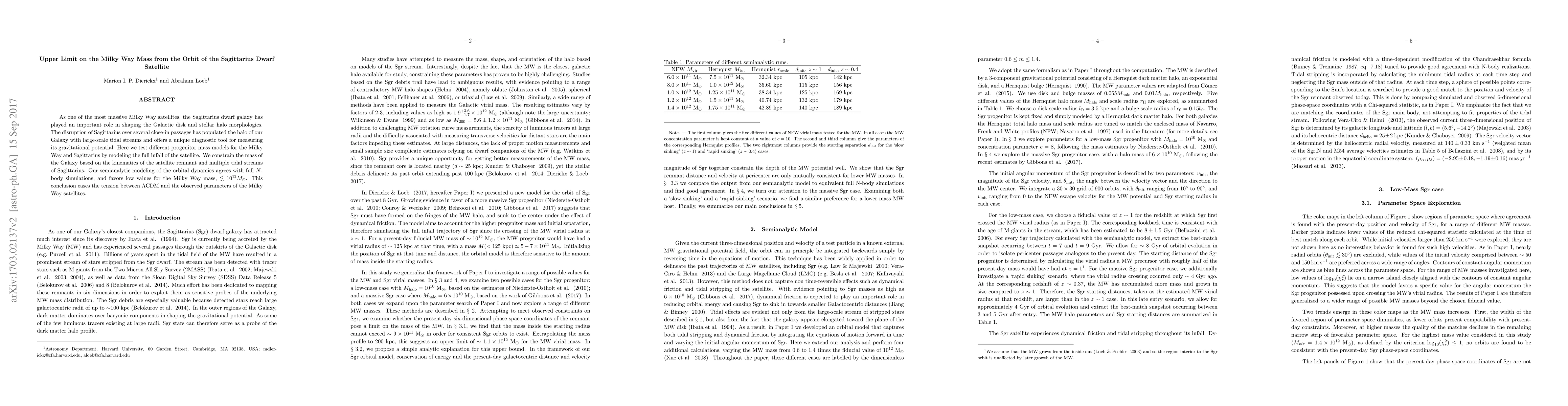 This paper investigates the Milky Way's mass using the orbital dynamics of the Sagittarius dwarf satellite, finding that the Galaxy's mass is likely below $10^{12}M_\odot$. This conclusion helps resolve discrepancies between $\Lambda$CDM models and observed satellite parameters.