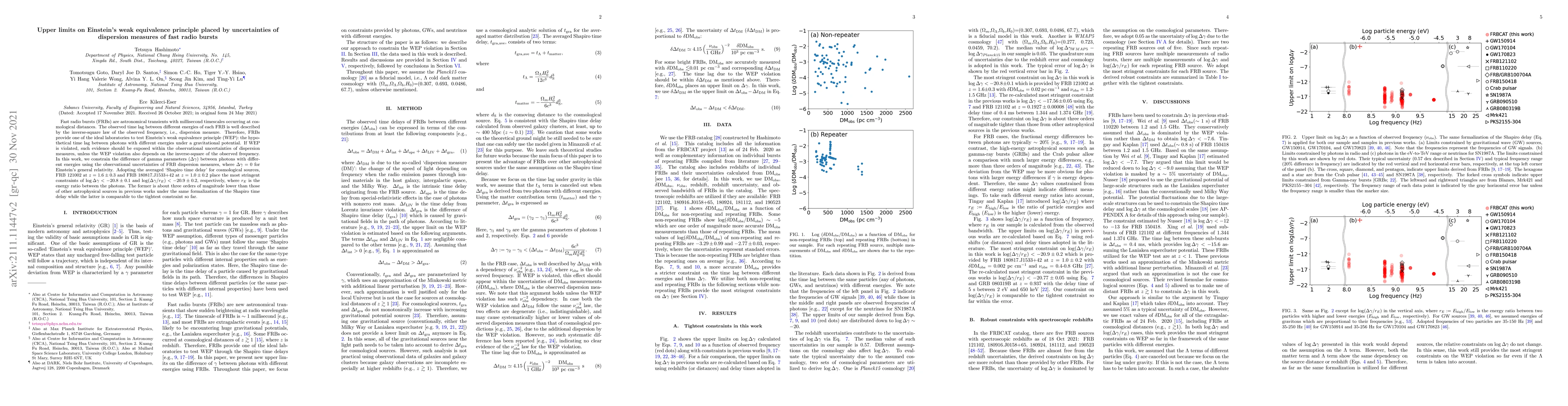 This paper uses uncertainties in dispersion measures of fast radio bursts (FRBs) to test Einstein's weak equivalence principle (WEP), finding stringent upper limits on potential violations. The results from FRB 121002 and FRB 180817.J1533+42 provide the most restrictive constraints on the difference of gamma parameters ($\Delta\gamma$), significantly improving previous astrophysical source constraints.