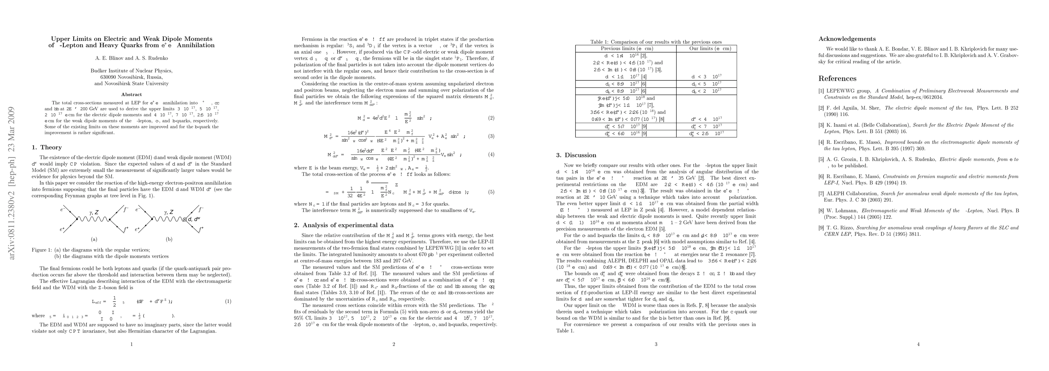 The total cross-sections measured at LEP for e+e- annihilation into tau+tau-, c\bar{c} and b\bar{b} at 2E ~ 200 GeV are used to derive the upper limits 3*10^{-17}, 5*10^{-17}, 2*10^{-17} e*cm for the electric dipole moments and 4*10^{-17}, 7*10^{-17}, 2.5*10^{-17} e*cm for the weak dipole moments of the tau-lepton, c-, and b-quarks, respectively. Some of the existing limits on these moments are improved and for the b-quark the improvement is rather significant.