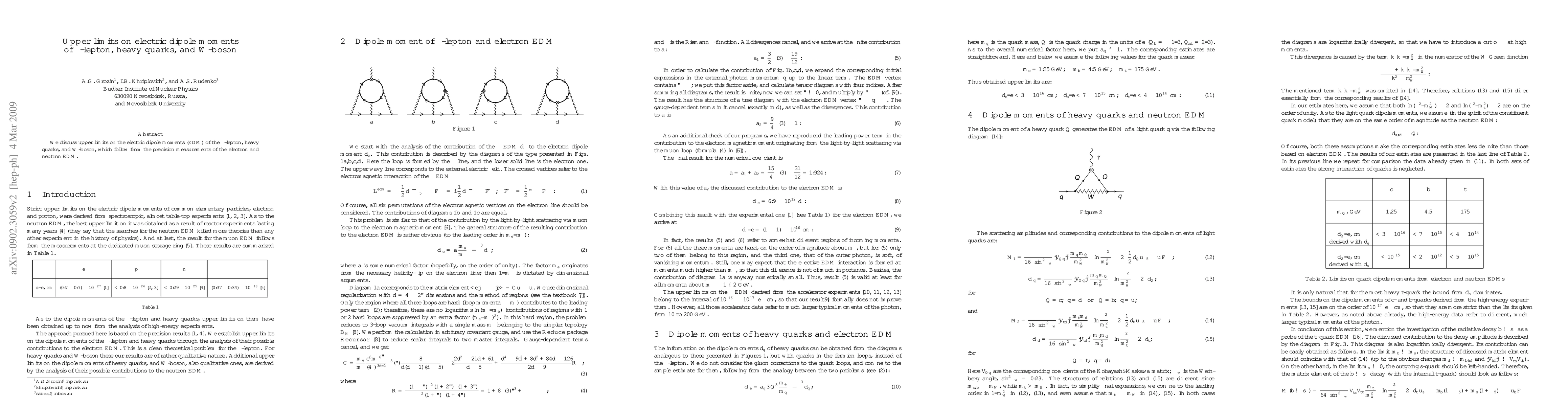 This paper presents upper limits on the electric dipole moments (EDM) of the tau-lepton, heavy quarks, and W-boson, derived from high-precision measurements of the electron and neutron EDM. These limits contribute to the understanding of fundamental symmetries in particle physics.