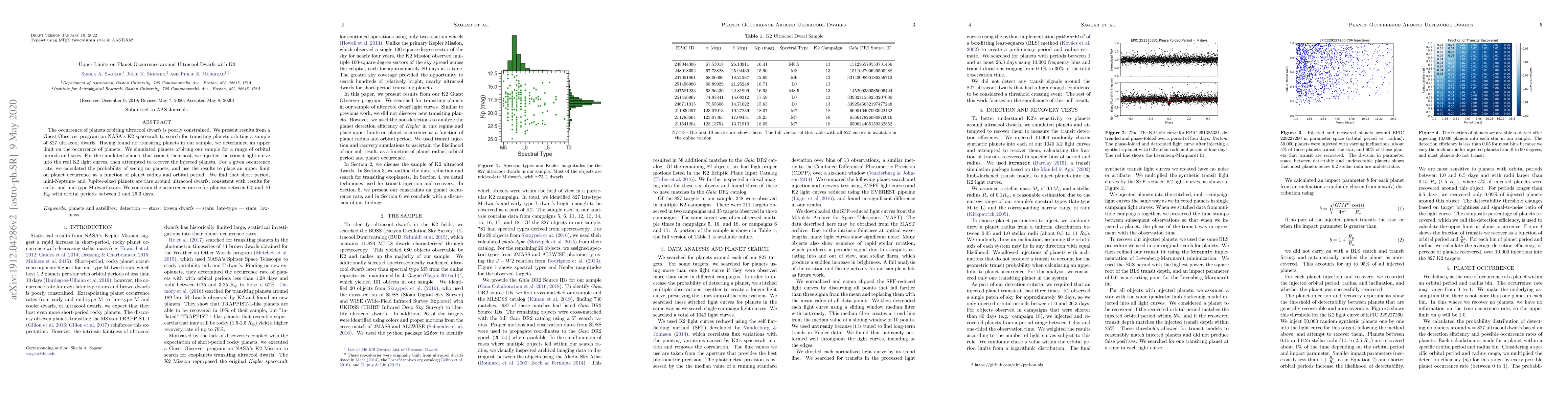 The occurrence of planets orbiting ultracool dwarfs is poorly constrained. We present results from a Guest Observer program on NASA's K2 spacecraft to search for transiting planets orbiting a sample of 827 ultracool dwarfs. Having found no transiting planets in our sample, we determined an upper limit on the occurrence of planets. We simulated planets orbiting our sample for a range of orbital periods and sizes. For the simulated planets that transit their host, we injected the transit light curve into the real K2 light curves, then attempted to recover the injected planets. For a given occurrence rate, we calculated the probability of seeing no planets, and use the results to place an upper limit on planet occurrence as a function of planet radius and orbital period. We find that short period, mini-Neptune- and Jupiter-sized planets are rare around ultracool dwarfs, consistent with results for early- and mid-type M dwarf stars. We constrain the occurrence rate $\eta$ for planets between $0.5$ and $10$ R$_{\oplus}$ with orbital periods between 1 and 26.3 days.