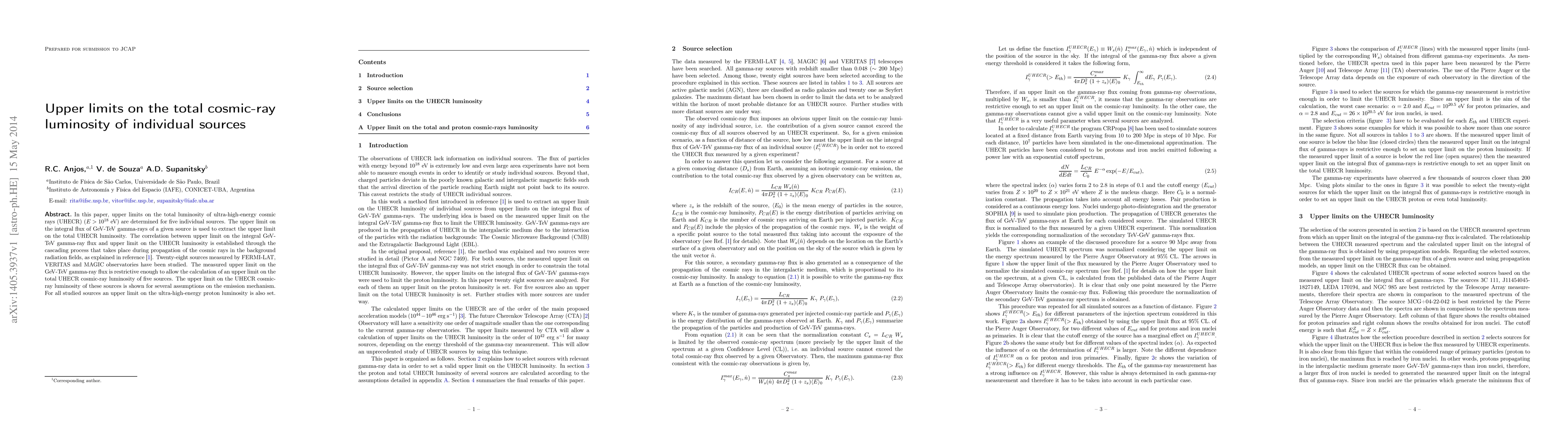 This paper determines upper limits on the total luminosity of ultra-high-energy cosmic rays (UHECR) for five individual sources, using the upper limit on GeV-TeV gamma-ray flux and the cascading process during cosmic ray propagation. It sets upper limits on the UHECR luminosity and ultra-high-energy proton luminosity for these sources based on various emission mechanisms.