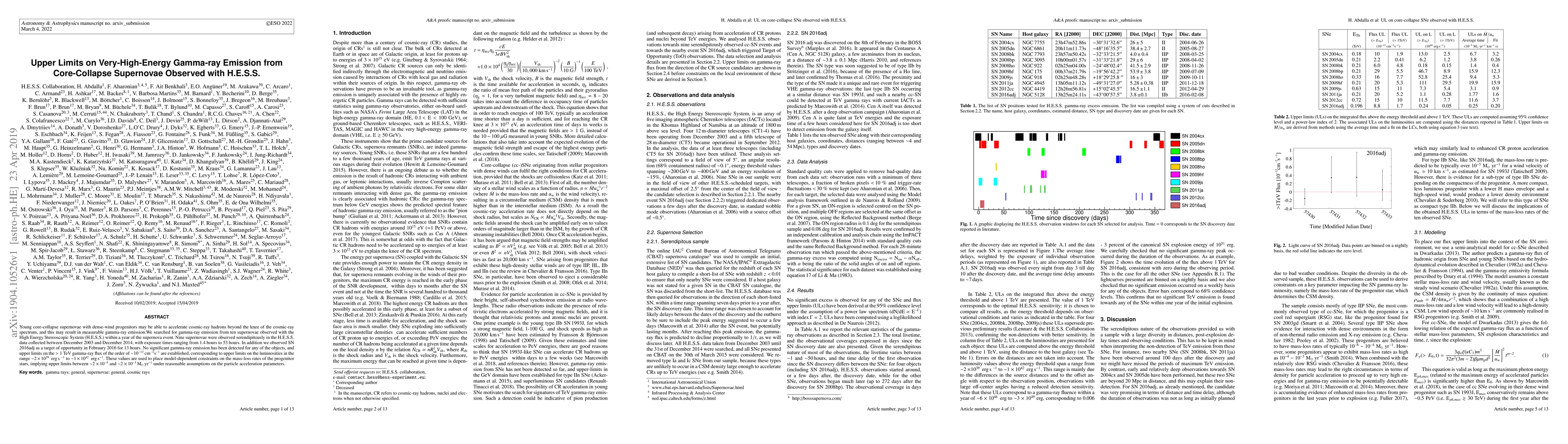 This study uses H.E.S.S. observations to search for very-high-energy gamma-ray emissions from ten core-collapse supernovae within a year post-explosion. No significant gamma-ray emission was detected, establishing upper limits on gamma-ray flux and luminosity, which in turn constrain progenitor star mass-loss rates.