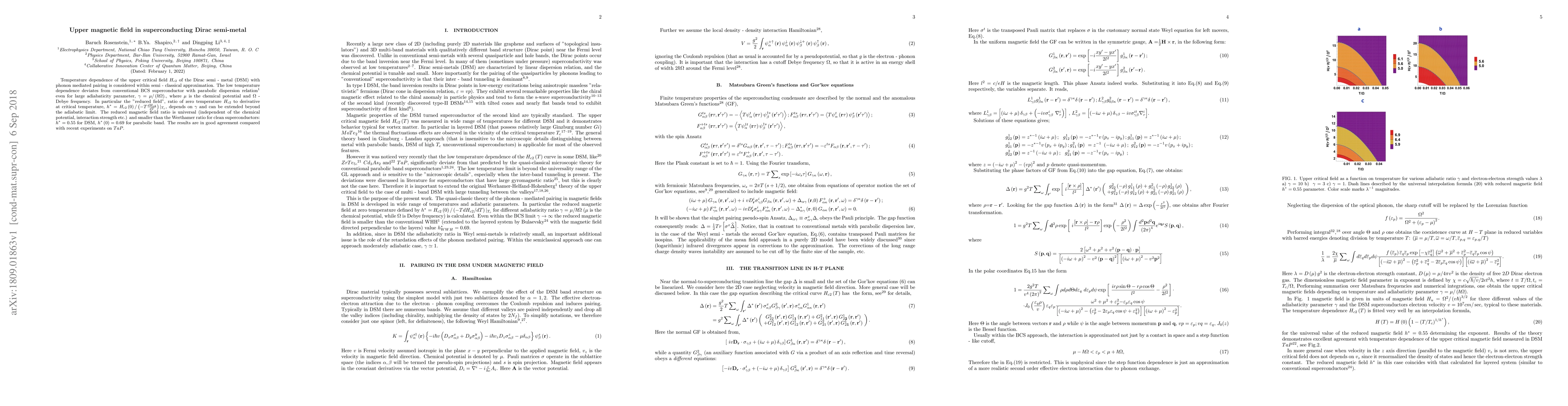 Temperature dependence of the upper critical field $H_{c2}$ of the Dirac semi - metal (DSM) with phonon mediated pairing is considered within semi - classical approximation. The low temperature dependence deviates from conventional BCS superconductor with parabolic dispersion relation\cite{WHH} even for large adiabaticity parameter, $\gamma =\mu /\left( \hbar \Omega \right) $., where $\mu $ is the chemical potential and $\Omega $ - Debye frequency. In particular the "reduced field", ratio of zero temperature $% H_{c2}$ to derivative at critical temperature, $h^{\ast }=H_{c2}\left( 0\right) /\left( -T\frac{dH_{c2}}{dT}\right) |_{T_{c}}$, depends on $\gamma $ and can be extended beyond the adiabatic limit. The reduced magnetic field ratio is universal (independent of the chemical potential, interaction strength etc.) and smaller than the Werthamer ratio for clean superconductors: $h^{\ast }=0.55$ for DSM, $h^{\ast }\left( 0\right) =0.69$ for parabolic band. The results are in good agreement compared with recent experiments on $TaP$.