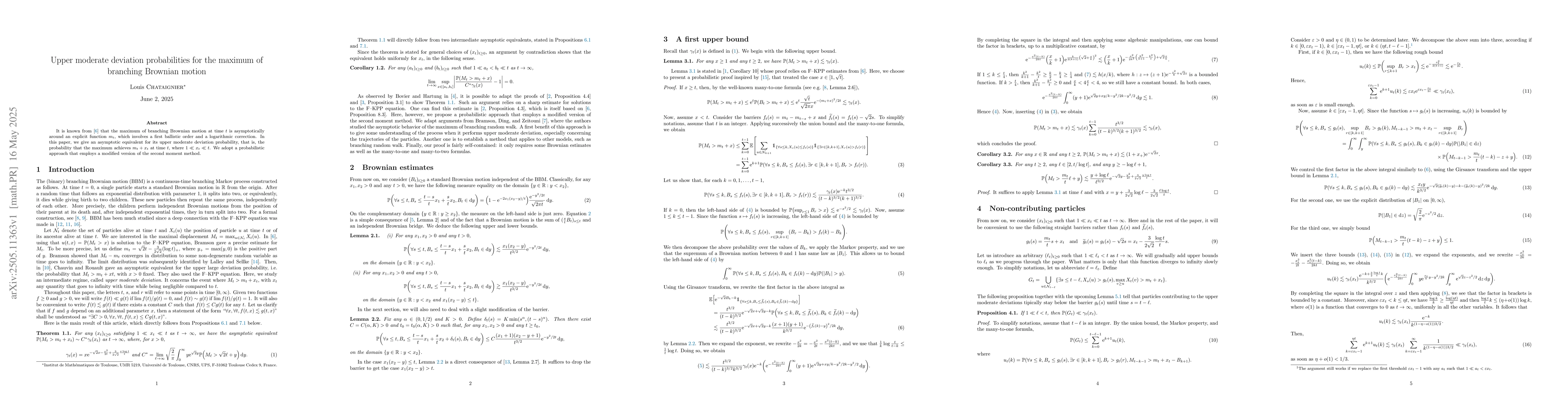 Development of a modified second moment method to derive asymptotic results for upper moderate deviation probabilities in branching Brownian motion.